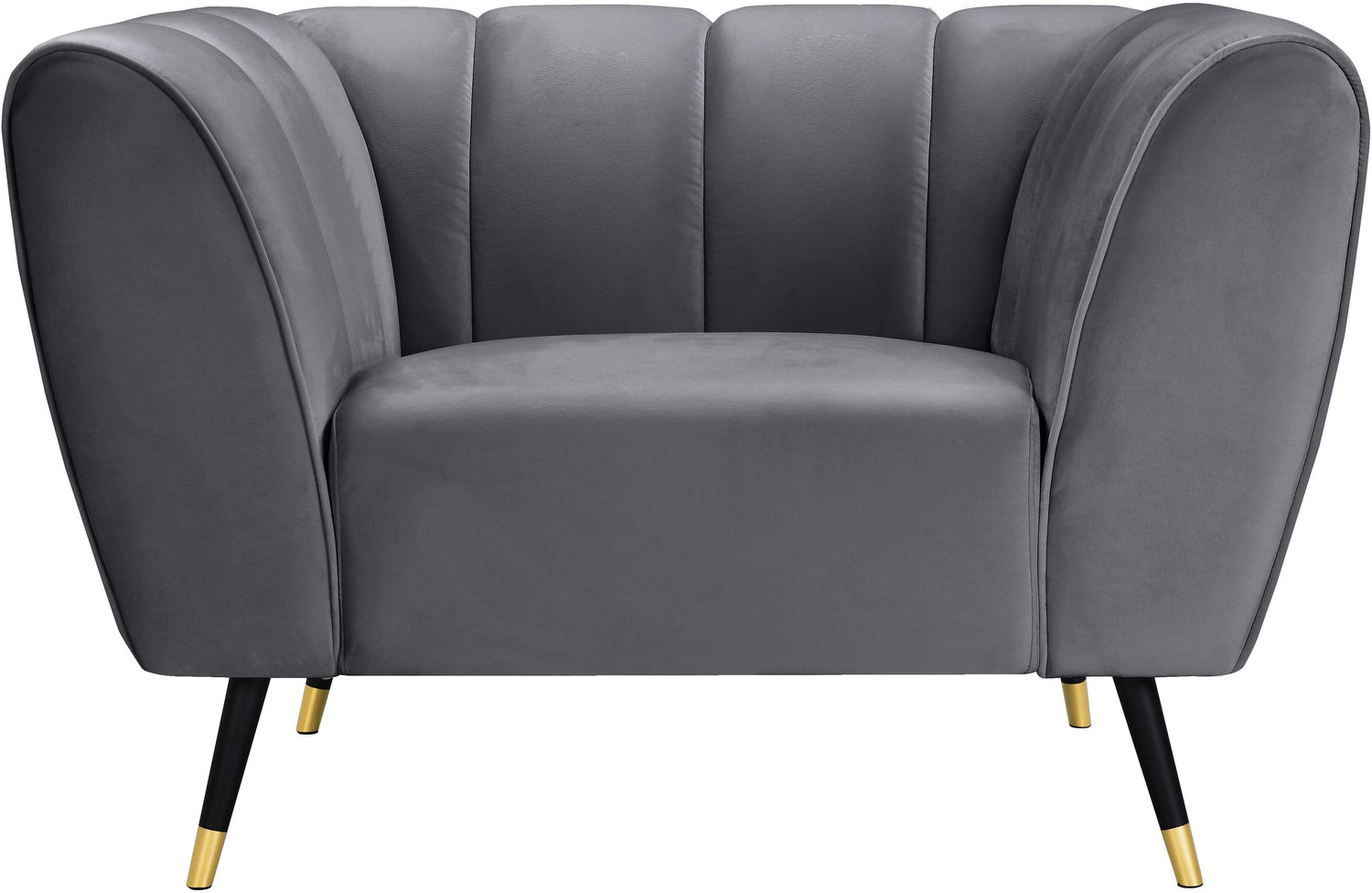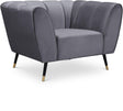 Sink your body into the inviting comfort of this Beaumont velvet chair. Upholstered in a soft shade of grey with black metal legs tipped in gold, this chair oozes modern charm and up-to-the-minute comfort. The heavily stuffed arms, seat and back are bound to beckon at day���s end for you to sit and relax. Deep channel tufting on the back and arms adds to its uber welcoming look. Pair it with the matching pieces in the same collection for cohesive beauty.