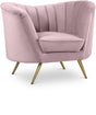 Lean back and lounge in luxurious style on this stunning Margo pink velvet chair by Meridian Furniture. This contemporary loveseat features plush velvet upholstery that is both classy and sumptuous against your skin, and rounded arms that curve into a low, rounded back, creating a perfect, modern piece for your home. Gold stainless steel legs support this chair and provide stunning contrast to the chair's plush, pink fabric.