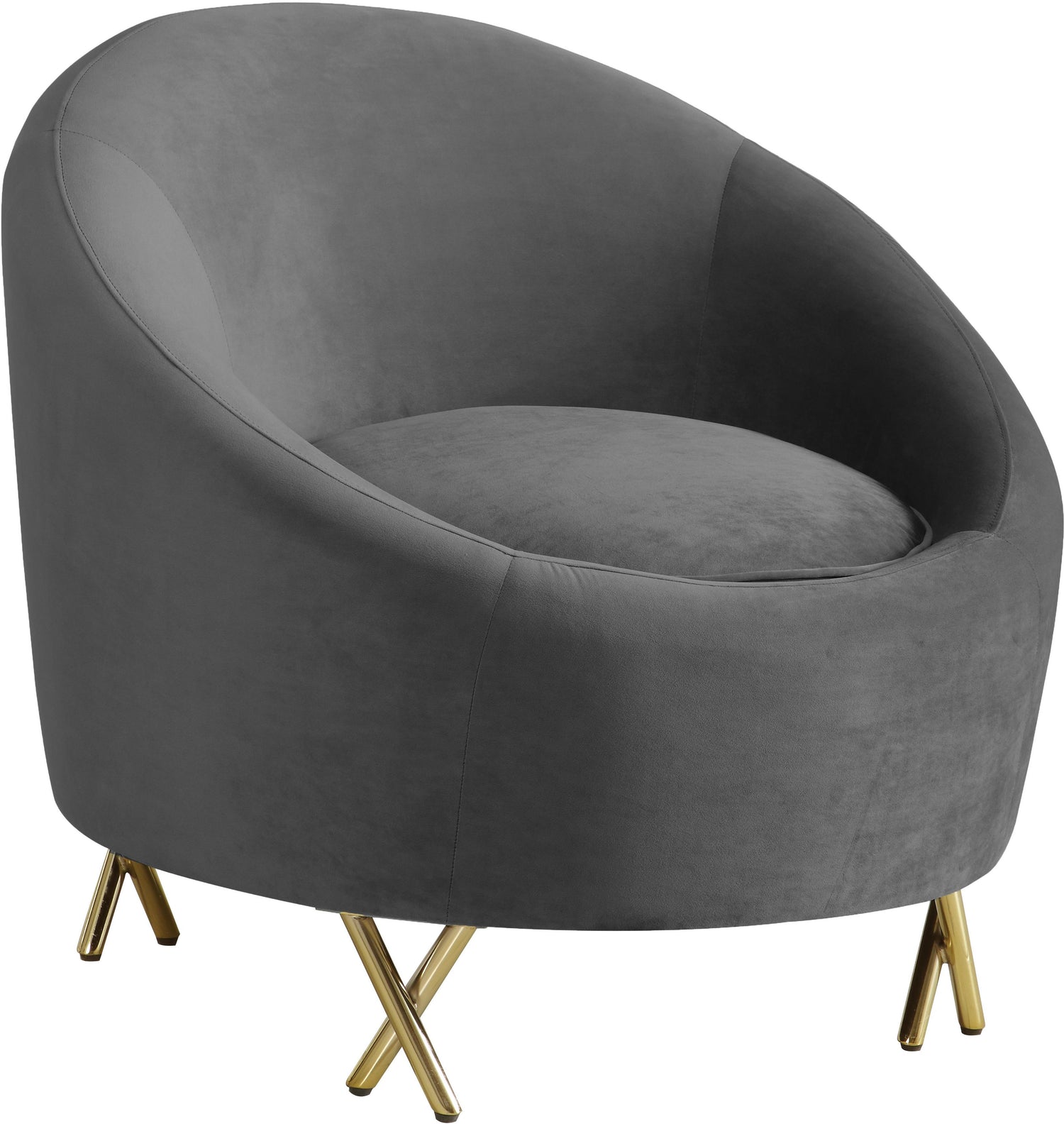 Give your living space a bold touch with this Serpentine grey velvet chair. This roomy chair features lush grey velvet upholstery that offers a soft, comfy place to rest that is pleasing to your senses, while its rounded, contemporary design mixes style and comfort. Gold steel legs complement the chair's grey color, giving it an elegant touch that?��Ǩ�Ѣs perfect for your chic home decor. Place this chair in a corner or next to an end table for additional seating options in your living room or den.