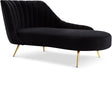 Lean back and lounge in luxurious style on this stunning Margo velvet chaise by Meridian Furniture. This contemporary chaise features plush velvet upholstery that is both classy and sumptuous against your skin, a single seat cushion and rounded arms that curve into a low, rounded back, creating a perfect, modern piece for your home. Gold stainless steel legs support this chaise and provide stunning contrast to the chaise's plush, black fabric.