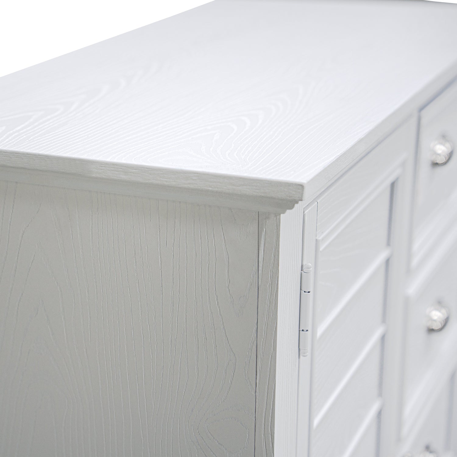 The Jamestown Door Chest in White is a perfect combination of durability, style, and practicality, designed to enhance any bedroom. Expertly crafted from solid Acacia, premium manufactured woods, and authentic Oak veneers, this door chest is built to last while preserving the natural elegance of real wood. The Jamestown collection brings modern coastal charm to your space, with clean, contemporary lines and a crisp, brushed white finish that brightens your room and evokes a serene, beach-inspired ambiance. Offering generous storage, the door chest is thoughtfully designed with clean lines and elegant panel detailing, blending practicality with sophisticated style to keep your bedroom tidy and clutter-free. The drawers glide effortlessly on robust full-extension glides, with meticulous dovetail joinery ensuring smooth operation and enduring quality. Additional thoughtful details include finished drawer interiors to prevent snags and a top drawer lined with soft velvet, providing extra protection for your most treasured items. This door chest is a chic and functional piece that brings both elegance and organization to any bedroom.