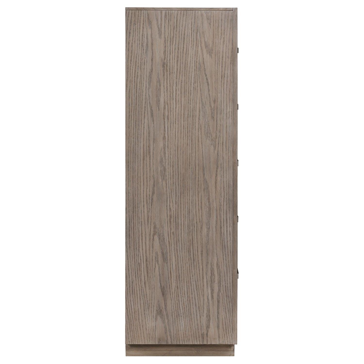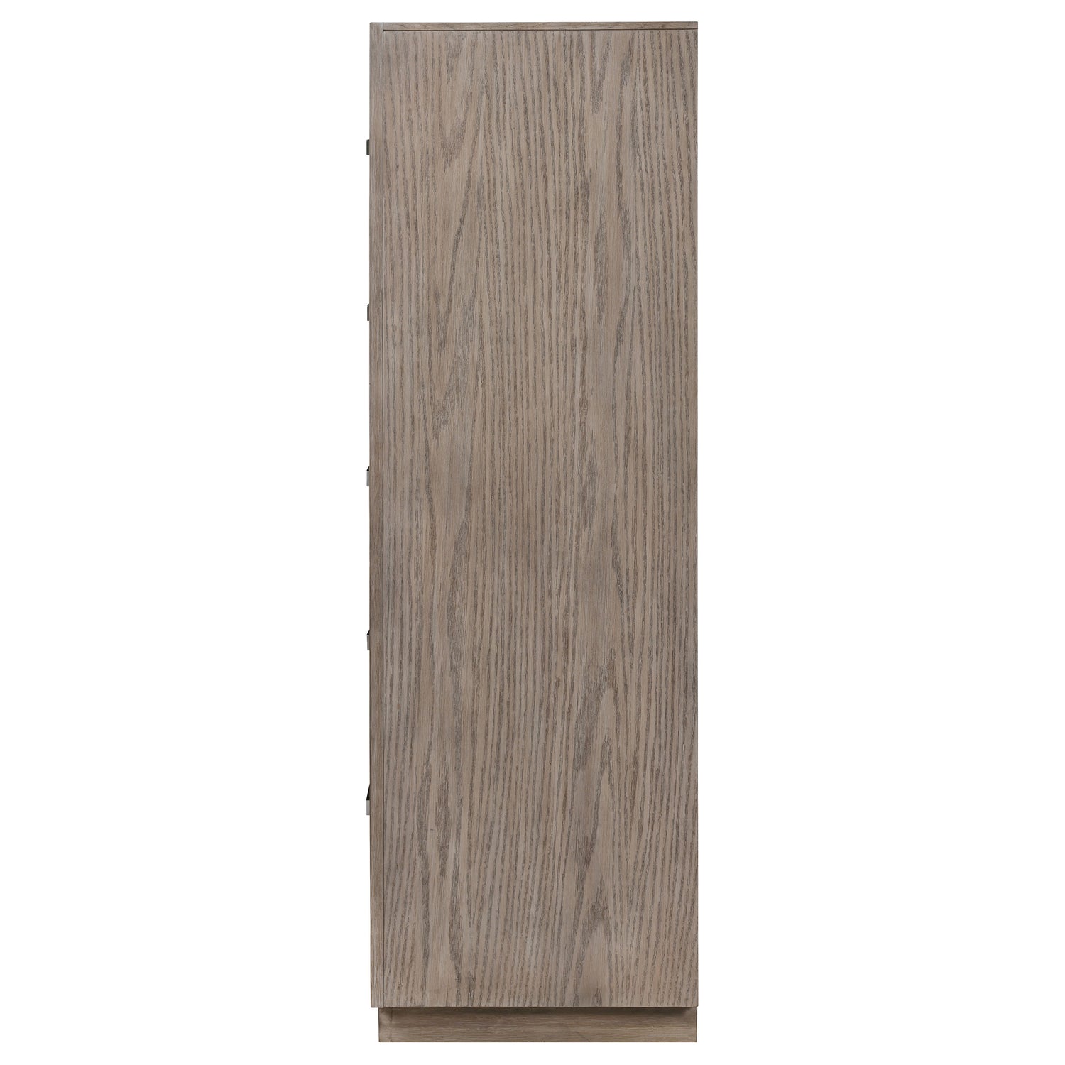 Chrome finish bar pulls add a touch of shine to the neutral barley brown finish of a modern five-drawer chest. Delivering ample storage with a compact footprint, the chest features a streamlined silhouette with mitered trim that creates a sense of depth. The top provides an easy spot for decor or a jewelry box that brings a personal touch. The soft wood grain finish of the chest complements in a variety of bedroom settings, making this a versatile choice for your home. The look is complete with a recessed base that provides a touch of height and airy presence.