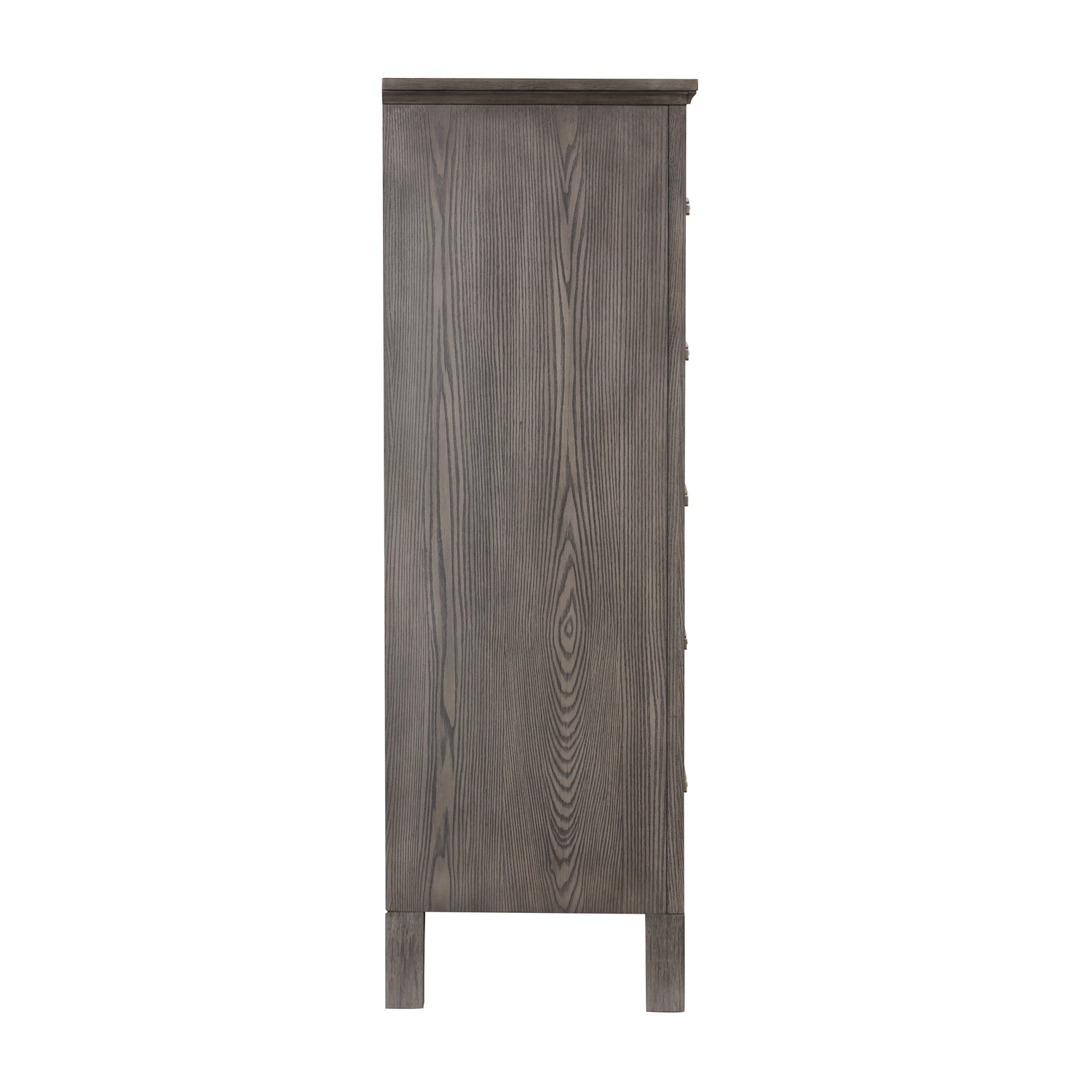 Elevate your bedroom storage with the Lisbon Chest in Gray. Crafted from Acacia solid wood and eco-friendly embossed oak laminate, this chest ensures enduring strength and durability. Its multi-step gray finish enhances the natural beauty of the wood, creating a sophisticated ambiance in your room. With 5 roomy drawers, this chest provides ample storage space for your clothing and belongings. Each drawer is meticulously crafted with heirloom construction, featuring English and French dovetail joinery, full extension glides, and finished interiors. The top drawers are lined with felt to protect delicate items. Combining traditional elements like bracket feet and picture frame moldings with modern brushed pewter hardware and a fresh gray finish, this chest offers a timeless style with a contemporary twist. The Lisbon Chest is the perfect blend of elegance and functionality for your bedroom.