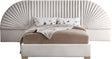 Enjoy sweet dreams in this beautiful Cleo cream velvet king size bed. The tall, luxurious velvet headboard is upholstered in a channel-tufted style, flanked by removable fan-shaped side pieces. The footboard and rails are comfortably upholstered in soft cream velvet as well, with gold steel legs supporting the frame. Matching pieces are available in the same collection, allowing you to complete the contemporary style of this look for an elegantly glamorous bedroom.