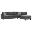 Enjoy a new family favorite for your living room, den, or entertainment room. This reversible 2-piece transitional sectional is a handsome addition to your home. Lounge in comfort on the plush dark grey chenille fabric seat and back cushions and rest your elbows on the armrests, all accented with self-welt details. Extra throw pillows come included for those occasions when a nap is necessary. For convenience, the reversible spacious chaise is perfect to recline on, and the dark brown tall tapered legs give the sectional added height. Key Features: • This elegant favorite has been recovered in soft chenille, featuring a subtle abstract accent pillow with a touch of metallic sparkle. • Reversible chaise accommodates any space • Self welt detail to seat and back cushions add a finishing touch • Pocket coiled seating for comfort and support • Dark brown tall tapered legs give added height