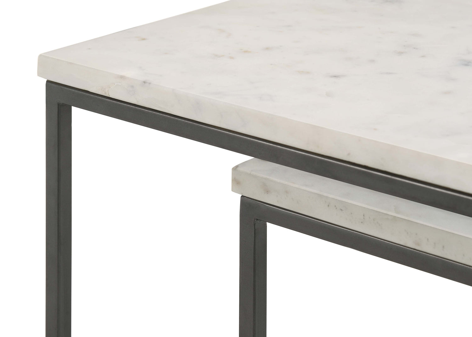 This nesting table set features genuine white marble tops and a sleek metal frame in a gunmetal powder-coated finish. Ideal for compact spaces, the tables stack neatly to save room, providing flexibility when extra surface area is needed. With slim legs and an open box-like design, these occasional tables offer a modern touch. Perfect for creating a sophisticated yet functional arrangement, the set is equally practical when used separately or as a cohesive trio.