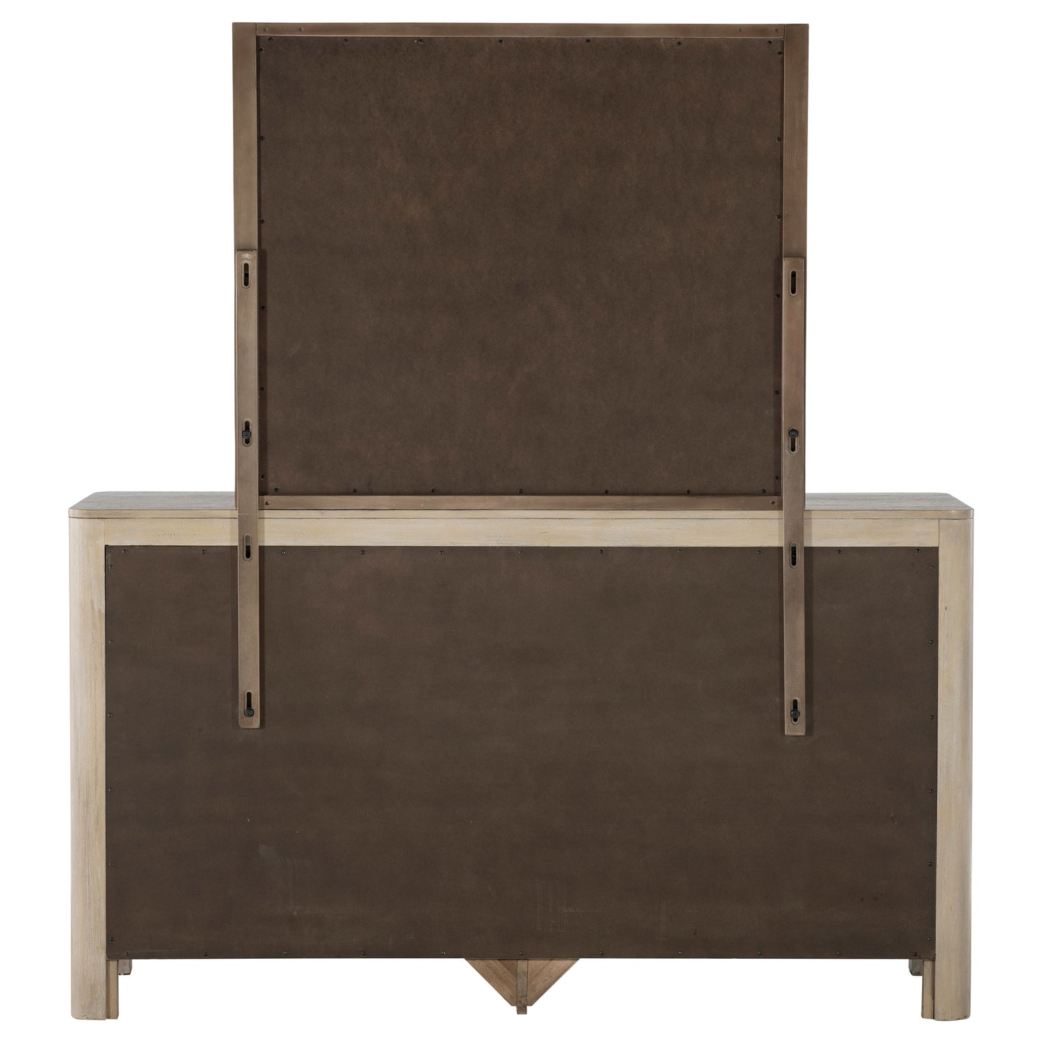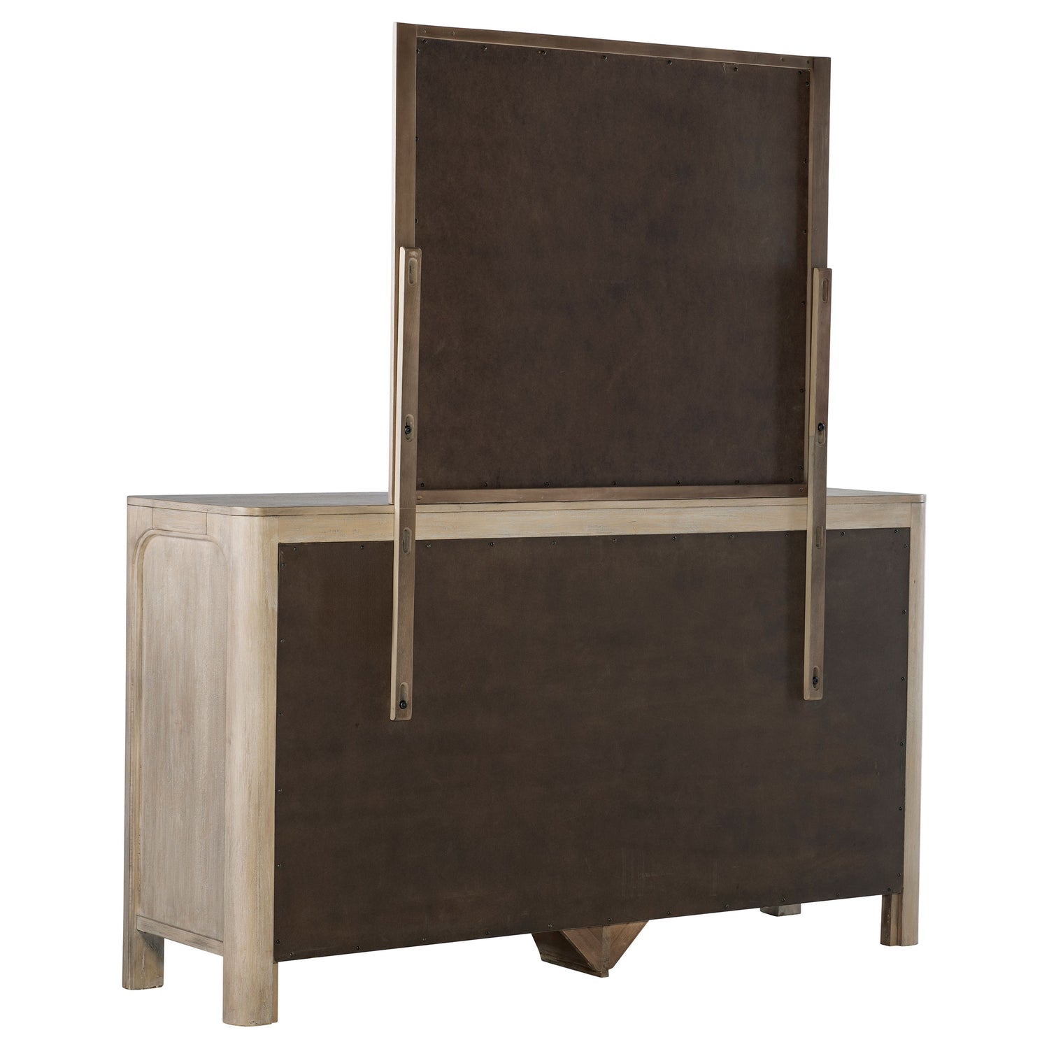 With its broad frame and softened curves, this dresser and mirror set radiates quiet confidence and poise. Sculpted edges flow gracefully around nine generous drawers, while the tall mirror reflects light and space with understated beauty. A hidden jewelry tray in the top drawer adds a thoughtful touch of luxury. Designed to bring harmony and order, this piece is both a centerpiece and a sanctuary for daily rituals. Key Features: • Nine-drawer dresser with sculpted edges and matching mirror for elegant bedroom storage • Weathered mango finish highlights the wood grain with a warm, organic appearance • Felt-lined top drawers offer soft storage for delicate items and daily essentials • Hidden jewelry tray in upper right drawer provides discreet organization • Heavy duty drawer glides ensure smooth, dependable movement and access • Crafted from mahogany, engineered wood, and mirror for beauty and durability
