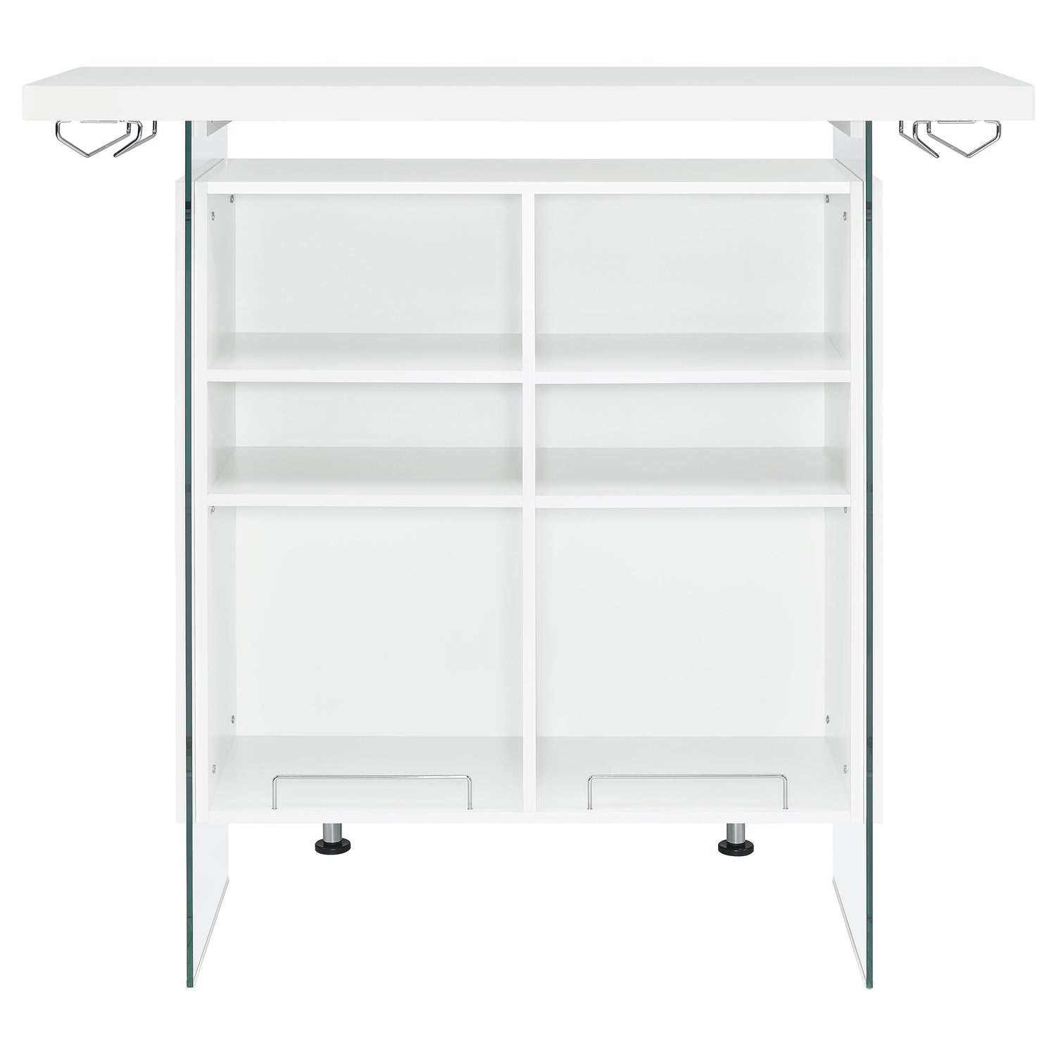 Elevate a multipurpose living room with this modern bar unit. A neutral finish, accented with polished chrome metal accents offers a striking design contrast. Supported and flanked by clear tempered glass side panels, this bar unit boasts ultra-modern elements as well for a dramatic feel. Compact yet highly functional, this bar unit also features ample storage space with six built-in open shelves for storing bottles, serving pieces and other mixologist must-haves. Tucked beneath the bar top along each side is a stemware rack for wine glasses and more. Key Features: • Modern front bar unit finished in white high gloss • Thick clear tempered glass side panels with steel footrest electroplated in chrome • Features six storage shelves and stemware racks • Constructed with MDF, particle board, glass, and metal
