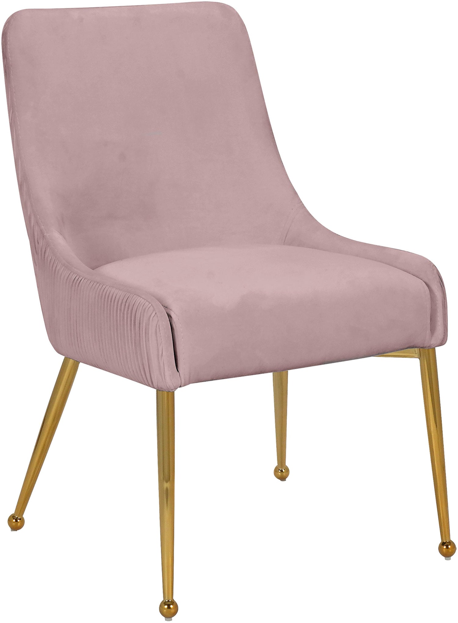 Elegance invades your dining room when you add this Ace velvet dining chair to the mix. This beautiful chair features the bells and whistles you need to take your dining room to the next level decoratively. The chair is outfitted in soft pink velvet upholstery with a pleated design for added textural appeal. Polished gold legs with ball feet and a matching gold handle on the back round out the design on a stylish note.