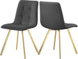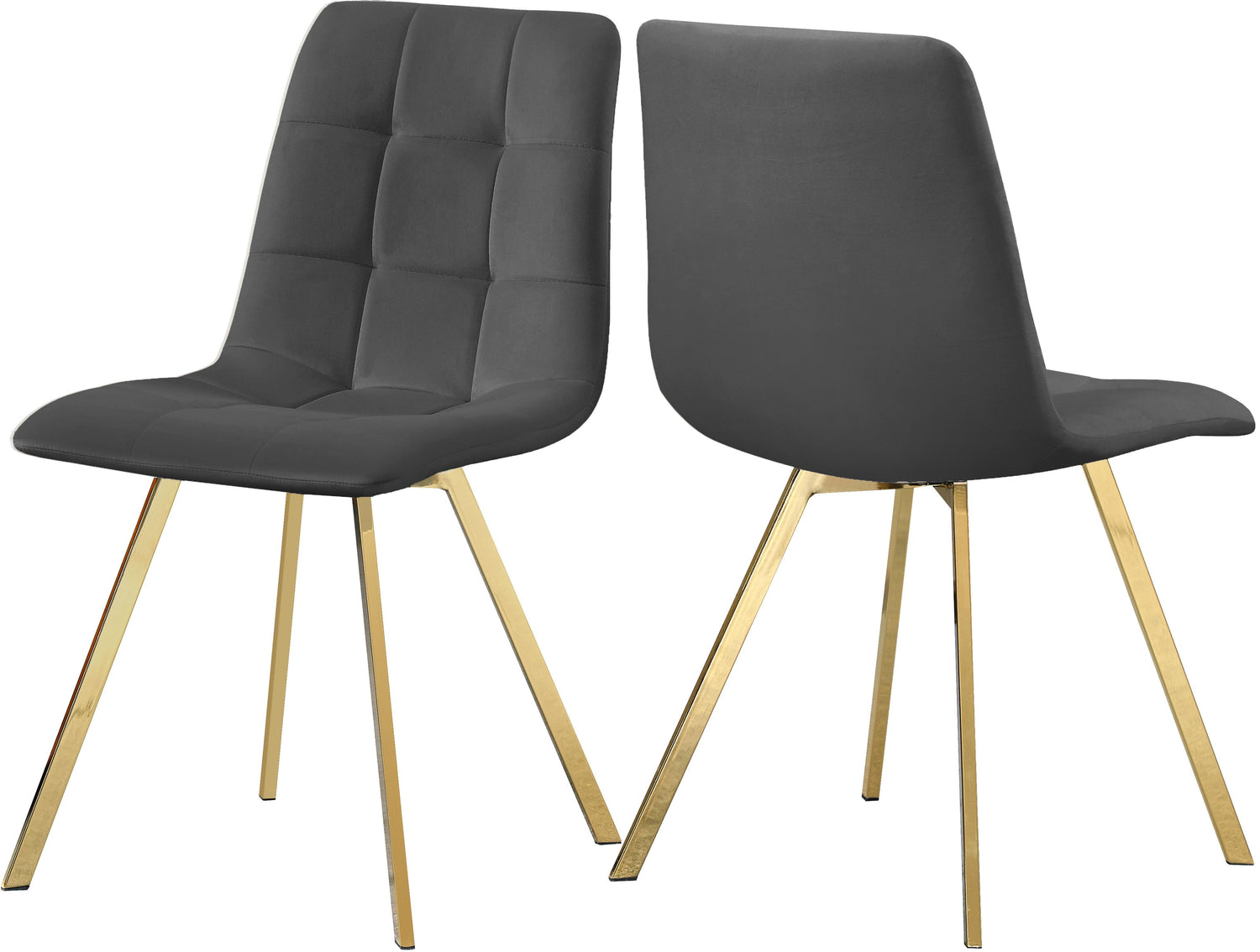 Pull up the Annie soft grey velvet dining chair and sit down for a little while. Decorated with attractive box tufting, this lightweight, contemporary chair has a backrest that gently curves into the seat, and both are cushioned for your comfort. The gold metal legs are square shaped, and they angle out gracefully to give this chair added stability. The Annie pairs nicely with several of the dining tables available.