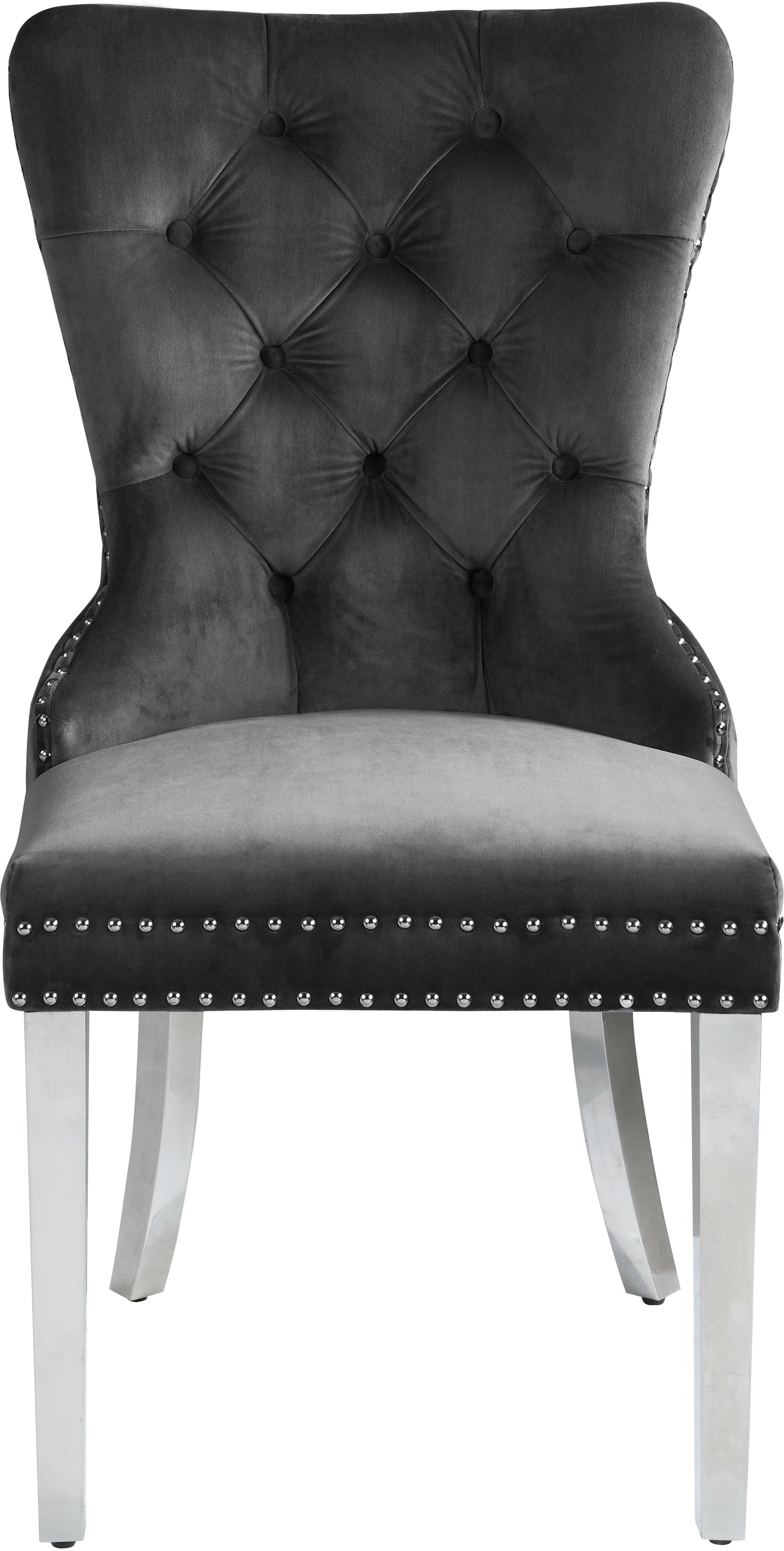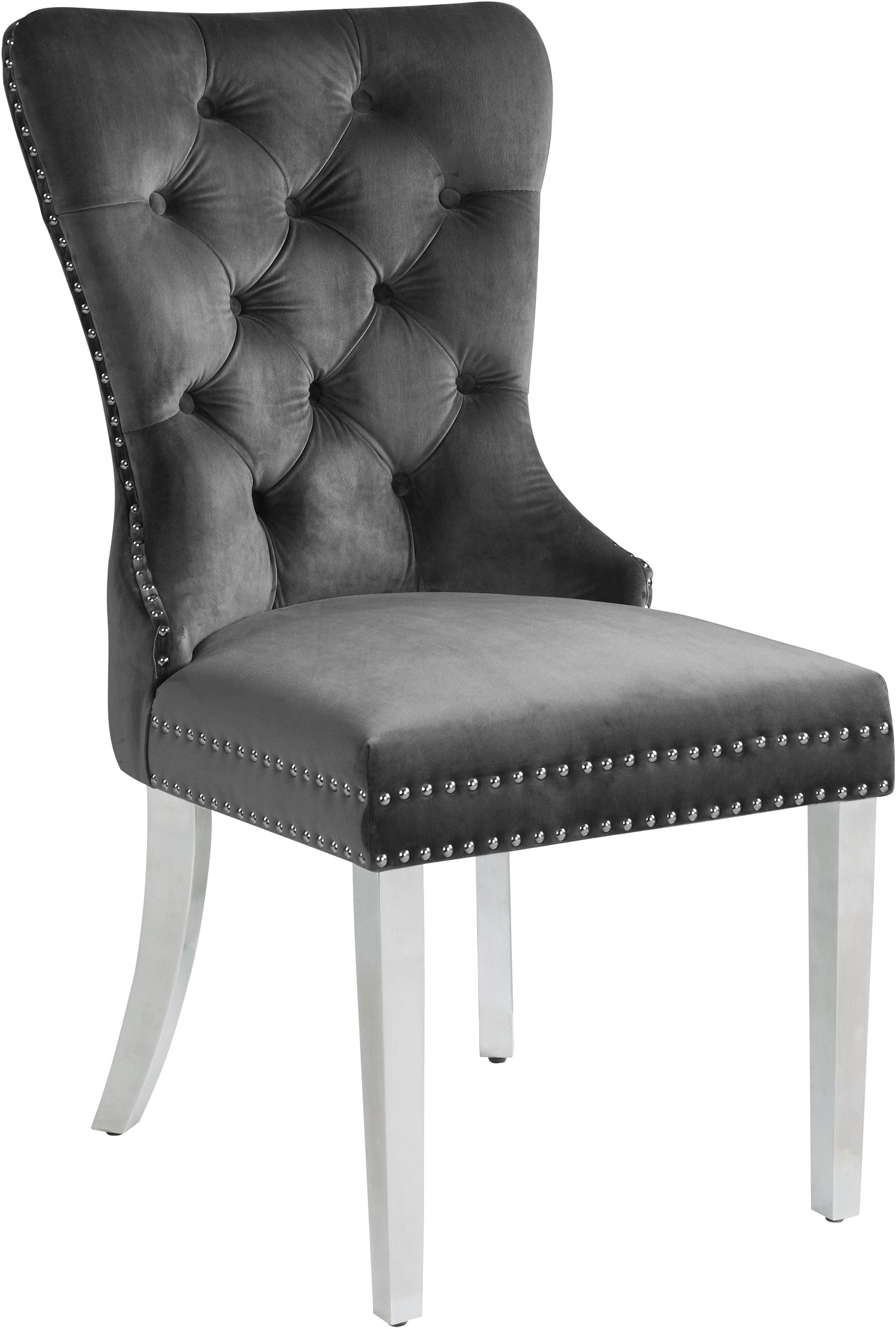 Transform your living space into a chic haven with this Carmen Grey Velvet Dining Chair. This eye-catching high-back chair offers plenty of back support, while its luxurious grey velvet upholstery and deep button tufting provides a soft texture, enabling you to recline in comfort and elegance. Chrome metal legs provide sturdy, durable support, and a matching chrome knocker on the chair's back gives it a unique, stylish touch that adds that extra bit of oomph to your contemporary home.