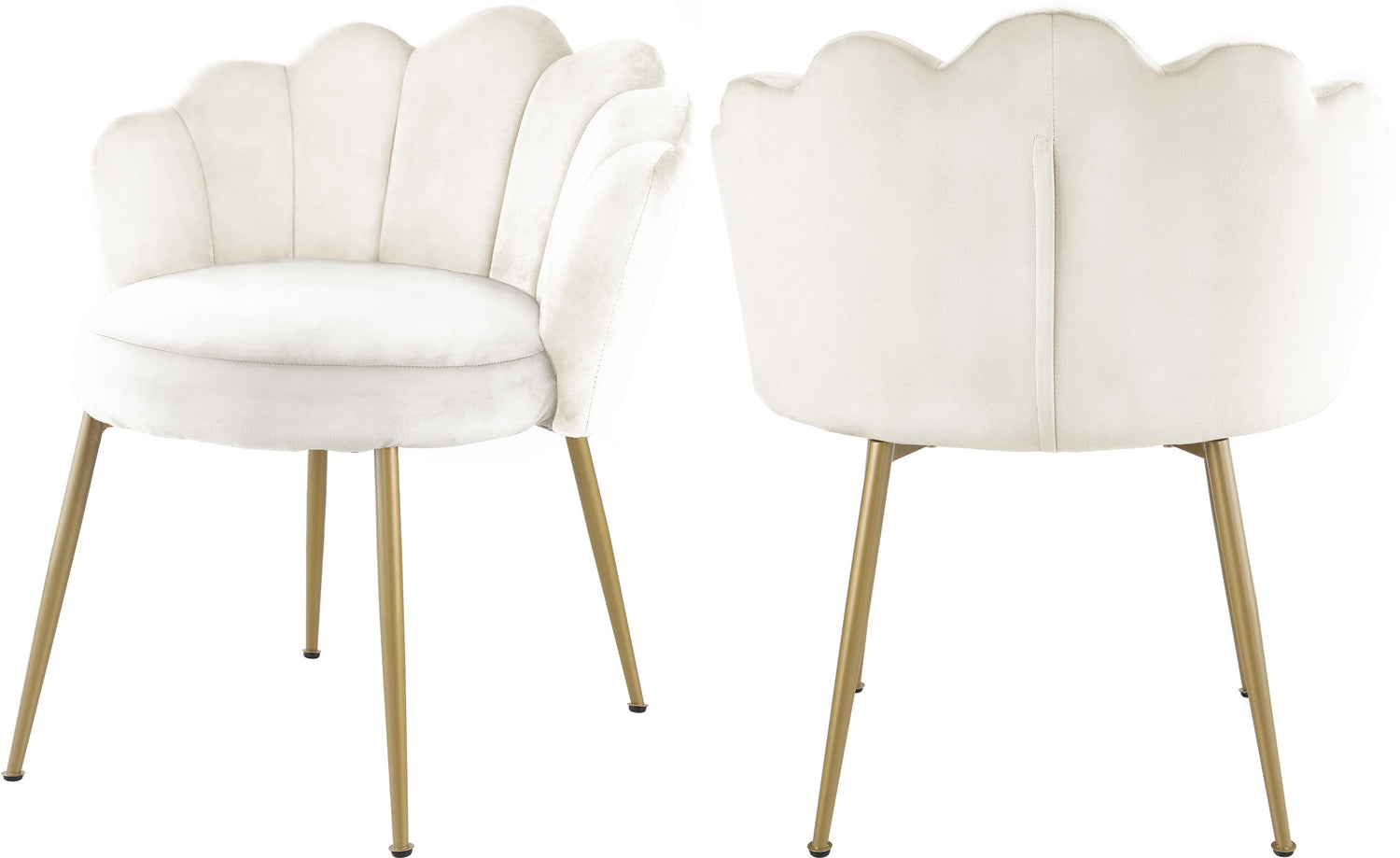 Sit back and get comfortable in this Claire Cream Velvet Dining Chair. Its elegant frame features soft plush cream velvet upholstery, providing you with a luxurious piece to rest upon while enjoying a meal or visiting with friends. Brushed gold steel legs offer sturdy frame support that complements the sleek appearance of this chair. Channel tufting adds extra stylishness to the chair's unique design, making it a great addition to any contemporary home decor.