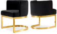 Lend your dining area a touch of retro charm with the Gianna Black Velvet Dining Chair from Meridian Furniture. The back of the chair has a barrel design that cradles you in comfort while you enjoy a meal with friends, and the chair is thickly padded and upholstered in plush black velvet for a luxe feel. The base is made from stainless steel with a gold finish for a finish that's stunningly beautiful.