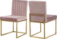 Take dining to a posh new level with this Giselle Pink Velvet Dining Chair. A boxy design makes it a nice addition to contemporary spaces, and it's armless design makes it easy to get into and out of with ease. The seat and back are upholstered in rich pink velvet for a lavish vibe and a pop of sumptuous color to liven up your room, and both are padded well to make sure diners stay comfy while they enjoy their meal. The metal frame is finished in gold for added beauty and aesthetic appeal.