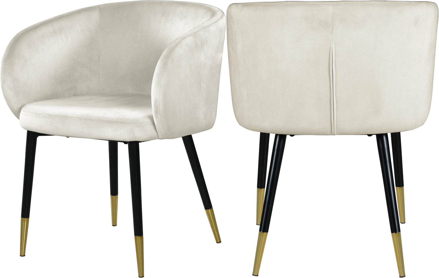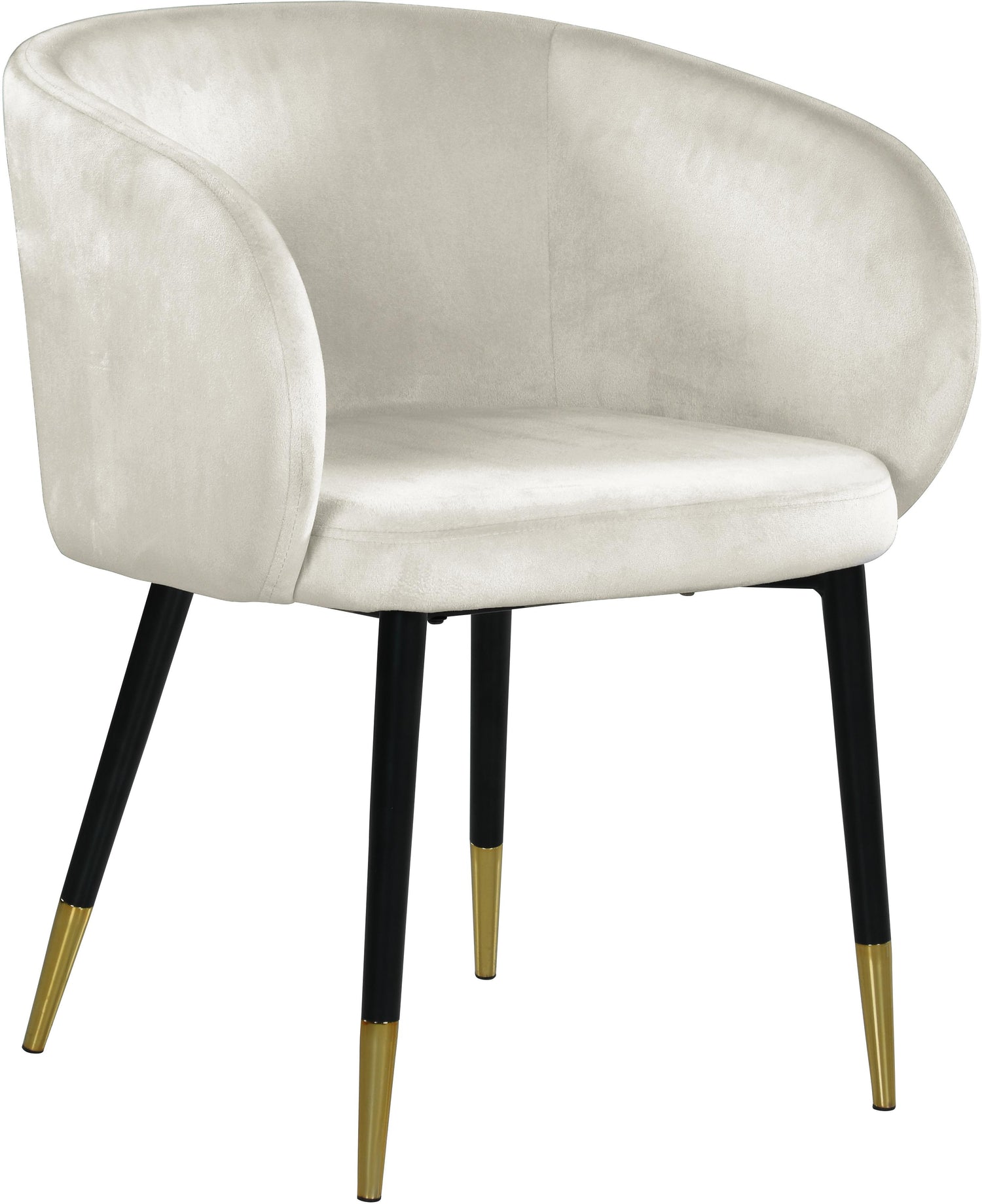 Redefine your living space with this modish Louise Cream Velvet Dining Chair. Featuring stunning velvet cream upholstery and a curved back, this chair offers a comfortable seat for you to relax in. With a frame supported by black metal legs with gold tips, this contemporary chair is not only sturdy and eye-catching; it���s stylish appeal and durability is sure to make it a favorite in your home for years to come.