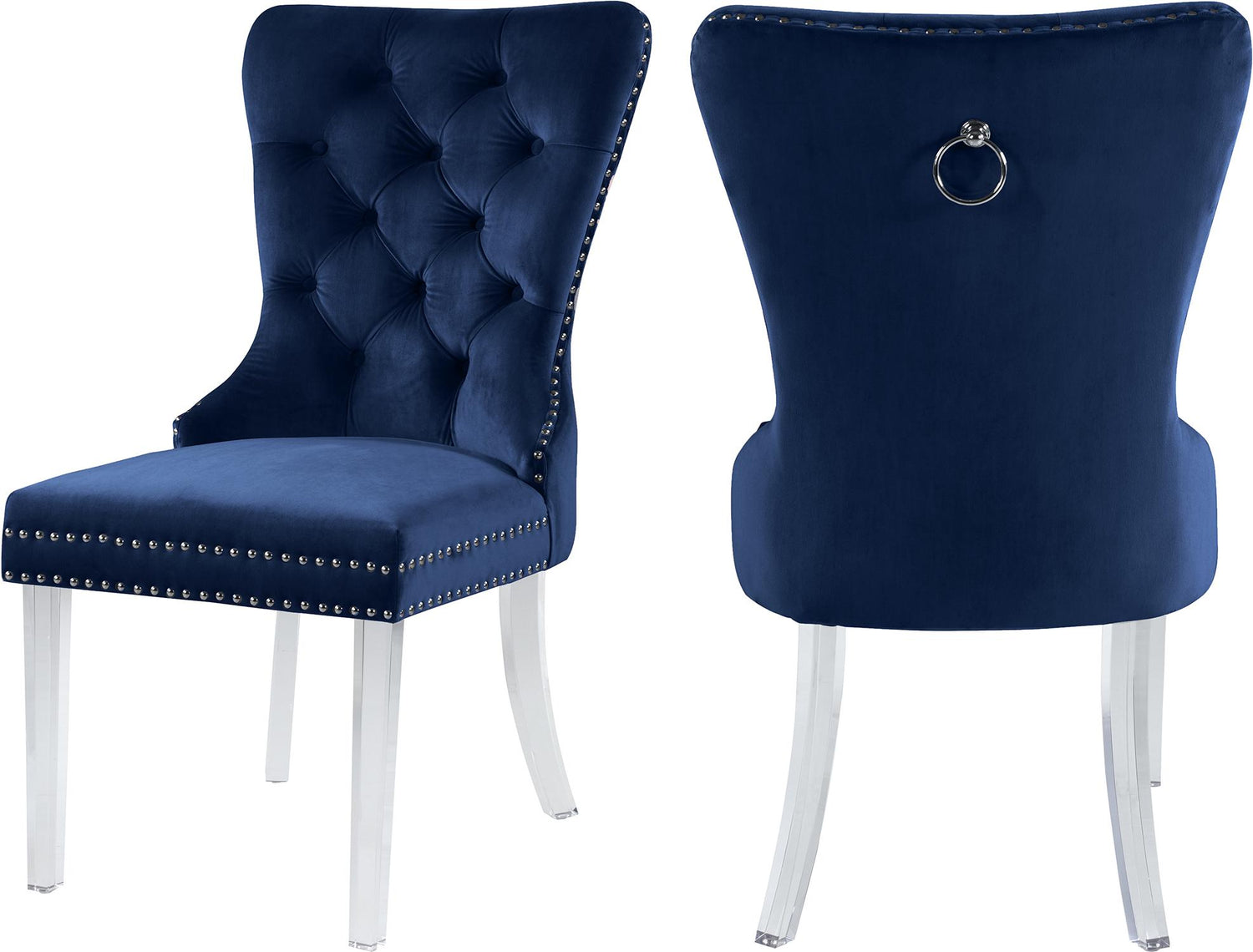 Dine in luxurious style with the Miley navy velvet dining chair. Featuring a curved high back, plush cushioned seat and deep tufted navy velvet upholstery studded with chrome nailheads, this dining chair is sure to take your dining experience to a whole new level. Clear Acrylic legs provide sturdy support and complement the stunning navy upholstery for a sleek, contemporary design.