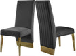 Bring the luxe look of this Porsha chair to your dining space. Impressing guests is simple when they're seated in this chair. The floor-length back is elegantly beautiful and creates a striking silhouette from every angle. Velvet upholstery material in a sophisticated hue of grey adds a touch of modernity to this chair, and the reverse is channel tufted for added elegance and refinement. Gold legs complete the look for added contemporary panache and sturdy support.