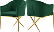 Spread elegance and modernity to your dining room with this Xavier green velvet dining chair from Meridian Furniture. This beautiful chair features a simple barrel seat with a plush cushion and back, ensuring that every meal is a comfortable one. The gold steel legs provide durable support while you sit, and an "X" leg in the back lends the chair an uber-modern vibe. Gold finishing on the base is sleek and chic, giving this chair a contemporary edge that's well at home in any modern dining room. Sleek green velvet upholstery is durable and tough yet soft against your body, elevating meal times to a luxurious experience.