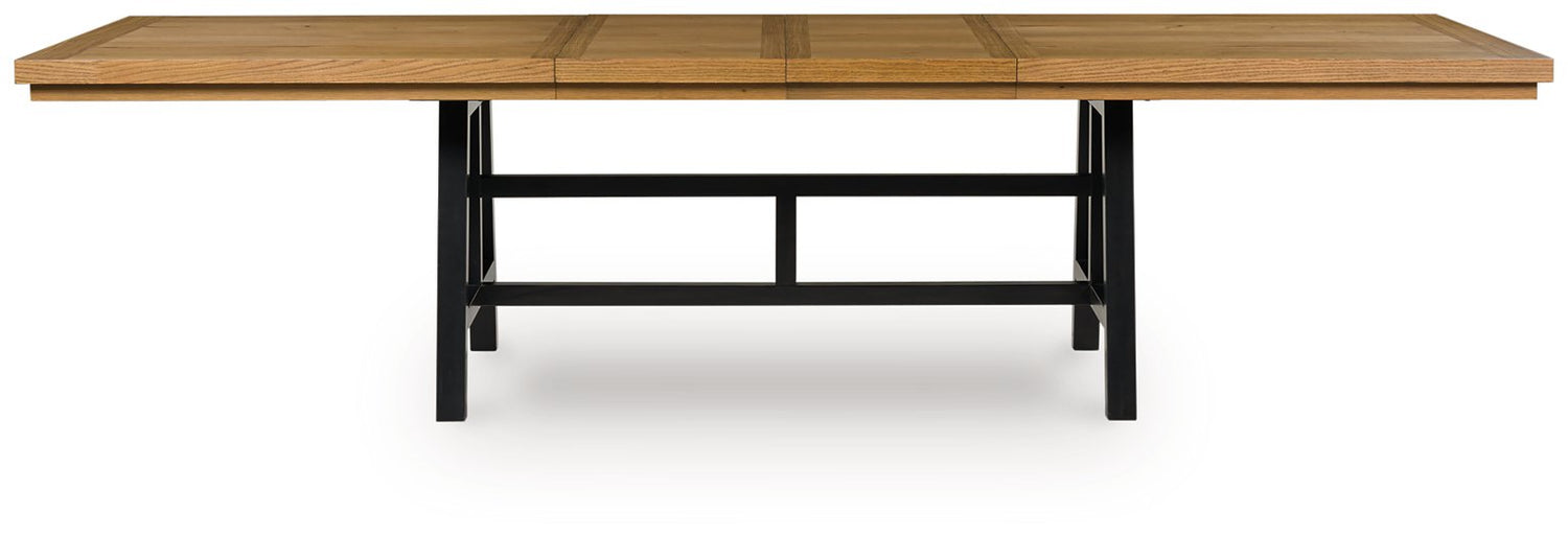 Features modern silhouette and reach in storage, covered in neutral fabric Urban Contemporary design with a rustic vibe. Made with hardwood solids, and thick rustic oak veneer. Natural wood may display natural weathering, unique cracks, splits, knots, saw marks or other organic features unique to each piece. Eclectic natural Oak and black finish scheme for a mix and match design style. Sturdy chunky legs support a thick table top with a rustic Oak finish. D841-01 spindle dining chair features a broad curved back rest with a modern take, finished in an aged black with rubbed-through edges. The cushioned seat is covered in textural woven polyester fabric. D841-02A arm chair features an inset synthetic cane back rest with a cushioned seat covered in a textural woven polyester fabric. Sideboard is finished in aged black with rubbed-through effects. Includes a reversible wine rack shelf, one adjustable shelf behind each cabinet door, synthetic cane door accents. The center drawer has fully finished drawer interior, with ball-bearing side guides and black felt bottom. D841-55 rectangular extension table features classic trestle table design in a two-tone finish. Aged black base with natural Oak top two 18” removable center leaves, can seat up to 10. D841-00 storage dining bench._x000D_
