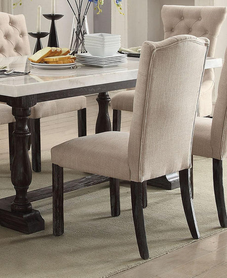 - The Gerardo dining collection delivers an elegant approach on rustic inspired design, and tapered profile with a white marble top for a deliciously modern serving of mixed media style. The fashion side chairs & arm chairs feature in a soft fabric and wooden tapered weathered espresso finish legs. You've designed your ideal table, from top to bottom in just the right size.