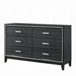 - Classic design with touches of modern aspects makes this Haiden Dresser ideal for any bedroom. The piece offers a rectangular tabletop and six storage drawers for displaying or organizing. It also features a glamorous shimmering silver accent trim that adds richness to design. The drawer handles with the same shimmering silver tie them all together to create a cohesive look. The black finish makes it easy to fit into already existing decor.