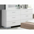 - High gloss white finish wraps the Lorimar 6-drawers dresser for a casual yet contemporary look to be added to your home. Keep clothing, accessories and bedding neatly stored away. White finish and horizontal drawer pulls with ball bearing side metal glide. Clean lines increase modern feel of the Lorimar contemporary dresser to create a modern and stylish appearance for your bedroom.