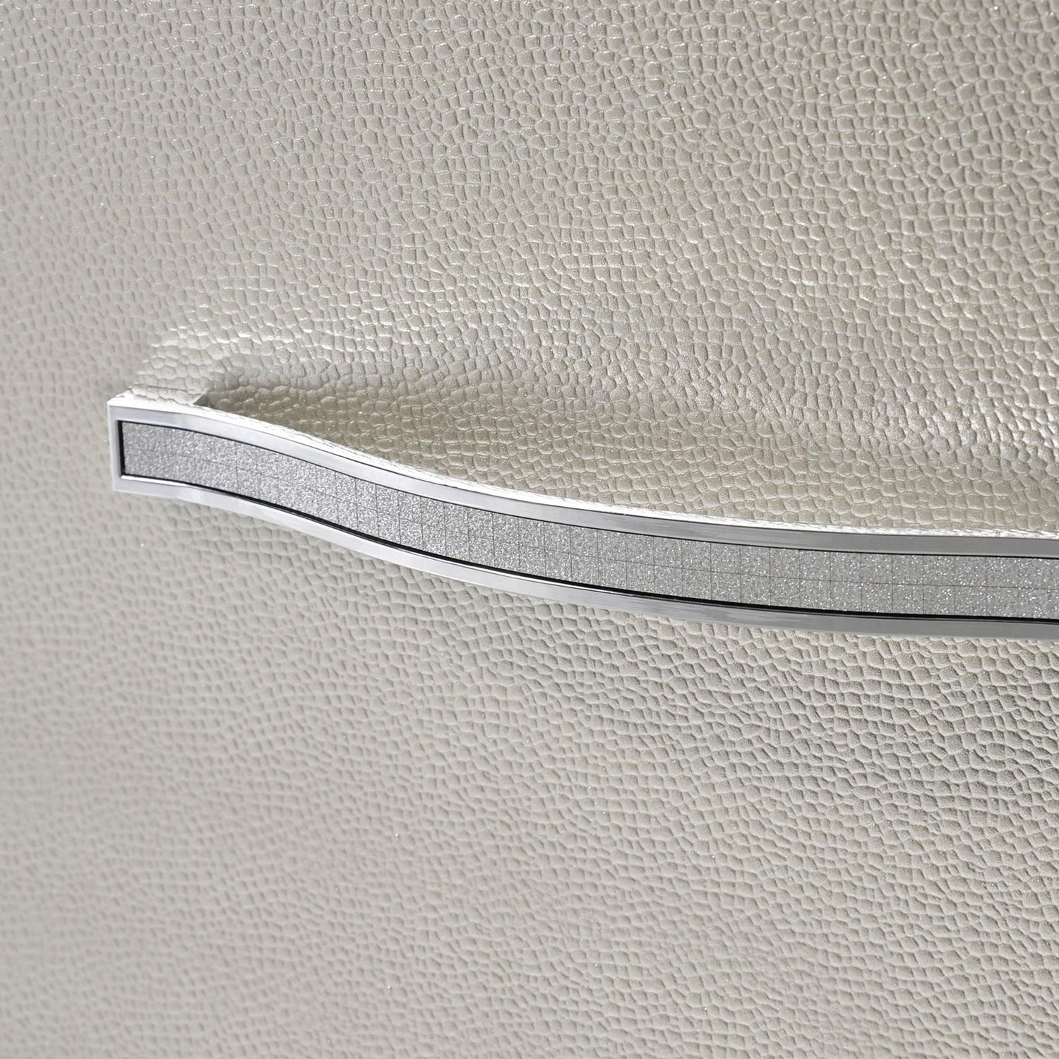 The Platinum Dresser & Mirror Set glams up your bedroom. Its chic champagne finish is accented by a decorative mirror trim throughout. Enjoy this pieces mood lighting featured in the mirror. Completing this fabulous look are sparkling, crystal and chrome handles to indulge your inner starlet - Mood Lighting in Mirror - Chic Champagne Finish - Glamourous Chrome Handles With Crystal Accents - Mirror Glass Trim - Stylish Bracket Feet Solid Wood and Plywood Framing; Engineered Wood; Metal Handles; Glass Mirror Detail Trim; Beveled Glass Mirror 20 D x 63 W x 74 H, 207lbs. 1 Year Limited Manufacturer Warranty