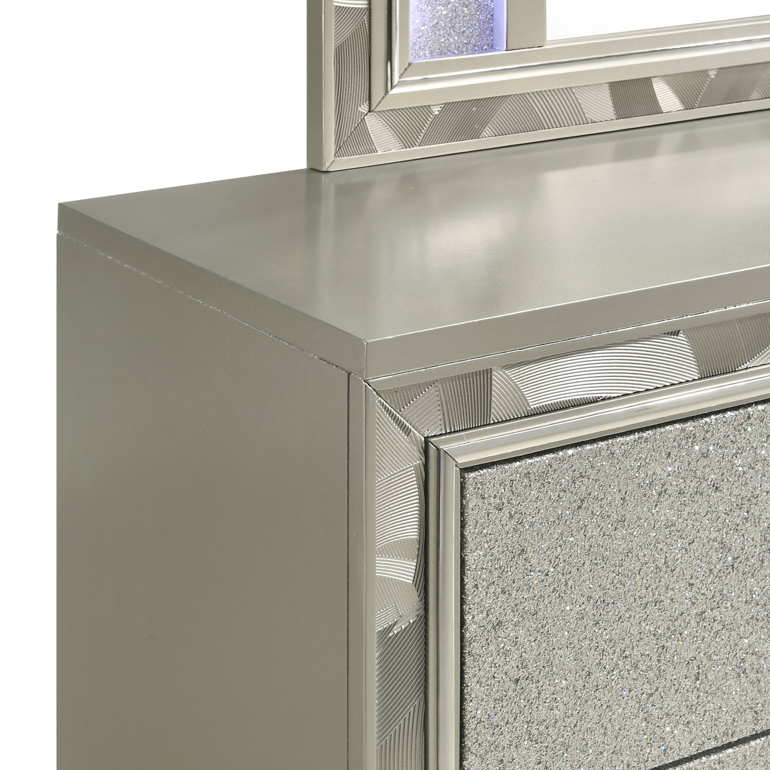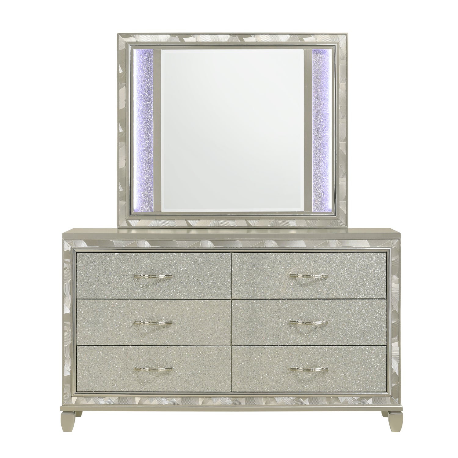Discover the Radiance Six Drawer Dresser in Platinum Silver, a fusion of sturdy construction and luxurious aesthetics. Crafted from a blend of Solid Rubberwood and engineered woods, this dresser guarantees stability and longevity. Its semi-gloss lacquer finish in Platinum Silver offers a sleek, contemporary allure. Adorned with Glossy textured inlays and mylar trim, the drawers boast a crushed crystal decorative laminate front, complemented by brushed chrome handles featuring inset crystal accents. With six English dovetail drawers equipped with full extension glides, storing your essentials becomes effortless. The finished interiors ensure snag-free storage, while the felt lining in the top drawers provides added protection for delicate items like jewelry, watches, or glasses. Elevate your bedroom decor with the functional elegance of the Radiance Six Drawer Dresser.
