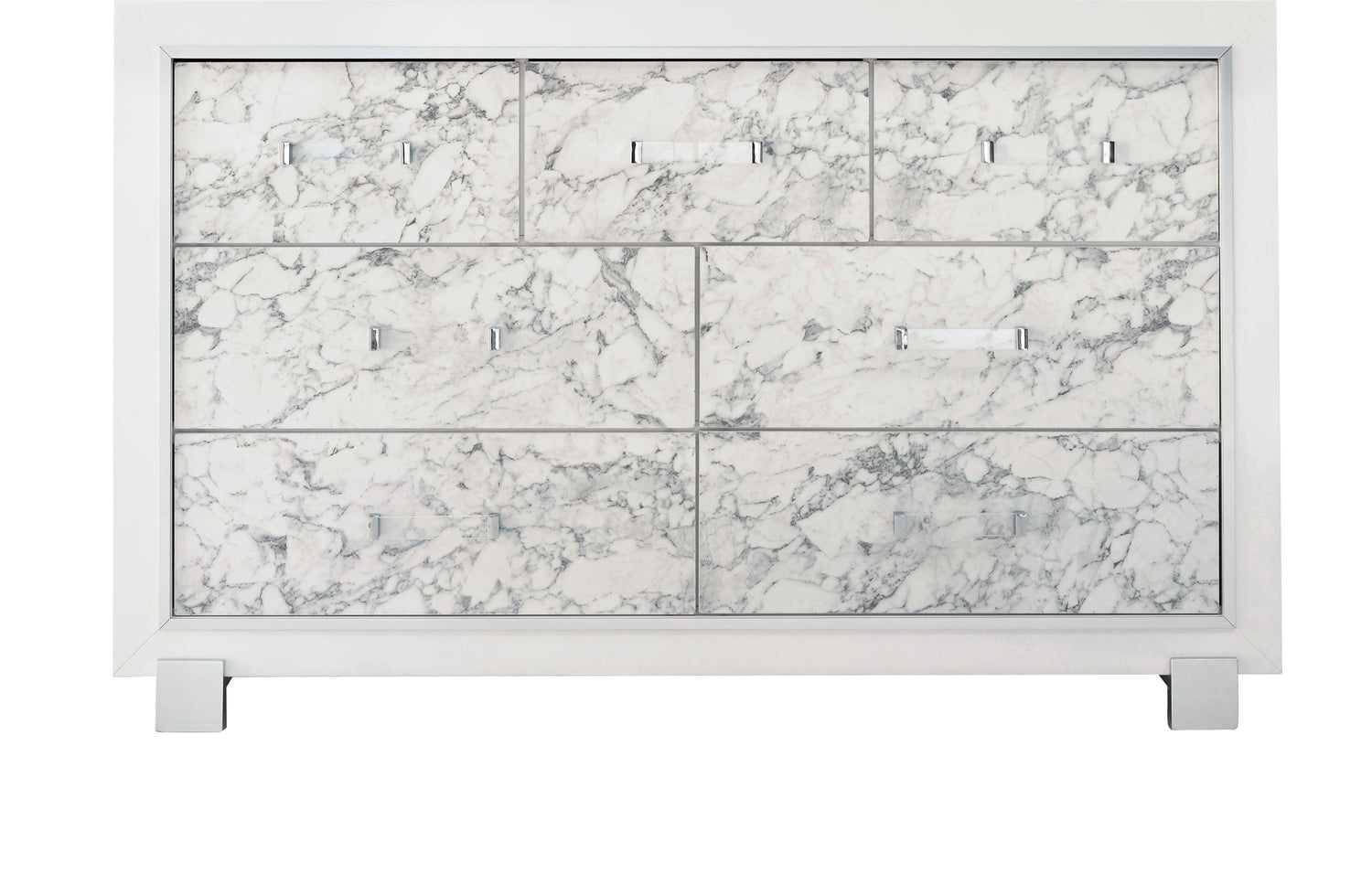 Introducing the luxurious Santorini dresser from Global Furniture USA. Presented in an exquisite white that can easily accommodate any room style or color scheme. Features include seven spacious drawers, faux marble drawer front detailing, block style feet, and bar style drawer pulls which together make this dresser beautifully modern. Created with quality craftsmanship in every facet to ensure durability and long-lasting wear. Look no further than this Santorini dresser to accommodate all your needs and upgrade the style of your bedroom.