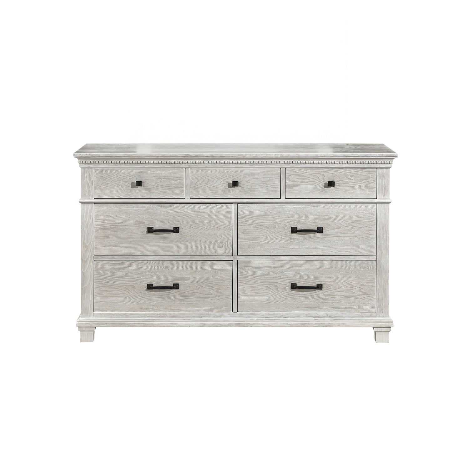 The Silver Sands Dresser combines durability and quality construction, crafted from solid pine, manufactured woods, and oak wood veneers for a strong and stable piece. Its transitional style merges clean, simple lines with a rustic wood finish, creating a calm and inviting atmosphere. The misty gray finish, achieved through a meticulous multi-step, hand-applied process, offers a light, weathered look that highlights the natural grain and mineral patterns of the wood. Elegant design features, including a raised base, full return and dentil moldings, and contrasting hardware, add a sophisticated touch. Heirloom-quality drawers with dovetail joinery and three-stage steel ball glides ensure smooth, full-extension operation and can support heavy loads. With seven spacious drawers, including velvet-lined top drawers to protect delicates, this dresser provides ample storage for clothing essentials. Combining style, durability, and functionality, this dresser is a practical and elegant addition to any bedroom.