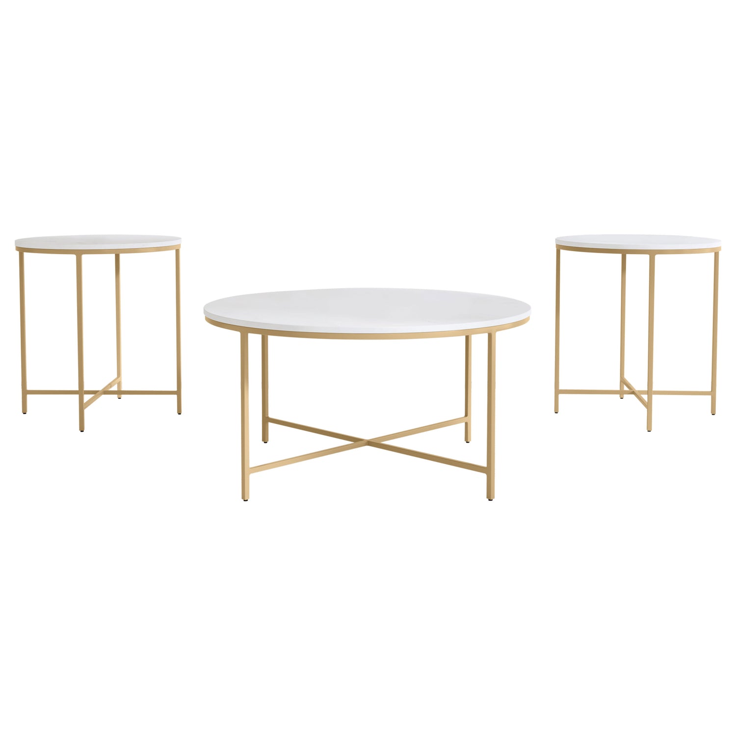 This coffee table set features a stunning combination of genuine white marble tops and welded iron frames in a sophisticated gold finish. Each table offers a modern, elegant design, with the sturdy metal frames supporting the luxurious marble surfaces. Ready to use right out of the box, these cocktail and side tables come fully assembled. Perfect for contemporary living spaces, this occasional set brings together timeless materials and a sleek, functional style.