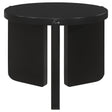 Nestled quietly by your sofa, this end table exudes a contemporary calm, its round shape a soft counterpoint to the angular lines of modern interiors. Solid wood bends and curves in a display of craftsmanship, presenting a substantial yet refined presence. The deep hue of the wood captures the eye, inviting a touch to appreciate its smooth finish. This side table is a silent guardian of your repose, holding your evening essentials with steadfast assurance.