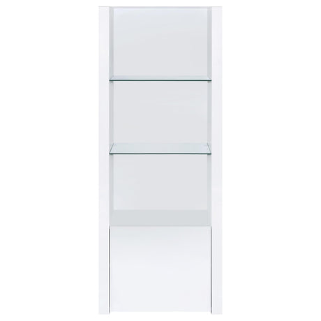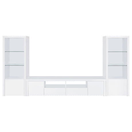Elevate your entertainment arena with our sleek, modern TV stand. Drenched in a pristine glossy white-on-white finish, it radiates sophistication, accentuated by clear glass details. Its soft-close drawers ensure smooth operation, while glass shelves present a chic display option. Generous storage compartments cater to all your media needs. To enhance the ensemble, the set comes with matching media towers, amplifying storage capacity and offering a unified, stylish appearance. This combo not only meets functional demands but also serves as a captivating focal point in any contemporary space. Key Features: • Sleek, modern design with pristine glossy white-on-white finish and clear glass details • Soft-close drawers for smooth operation and glass shelves for chic display • Generous storage compartments to meet all media needs • Matching media towers to amplify storage capacity and create unified, stylish appearance • Captivating focal point for any contemporary space