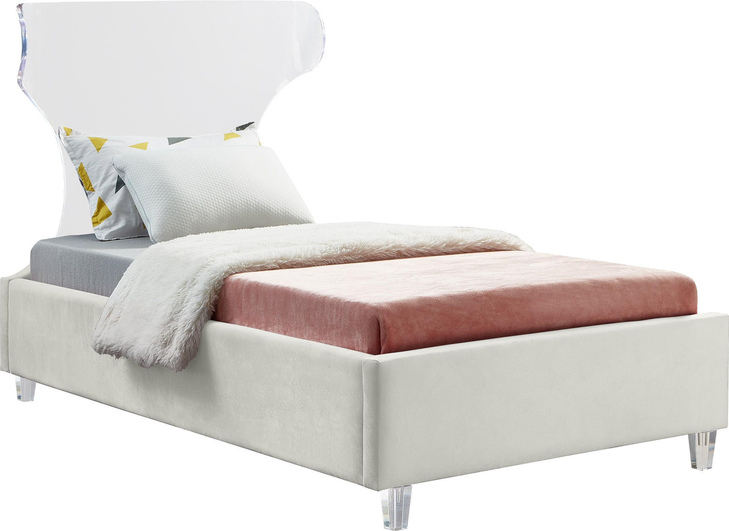There's nothing scary about the Ghost cream velvet twin size bed, with its plush cushioned and upholstered side rails and footboard. A curved transparent acrylic headboard allows you to situate it in front of a window without blocking the view, and matching acrylic legs offer a beautiful contemporary appearance. This bed has a complete set of slats included for your convenience, so you won't need to purchase a box spring.