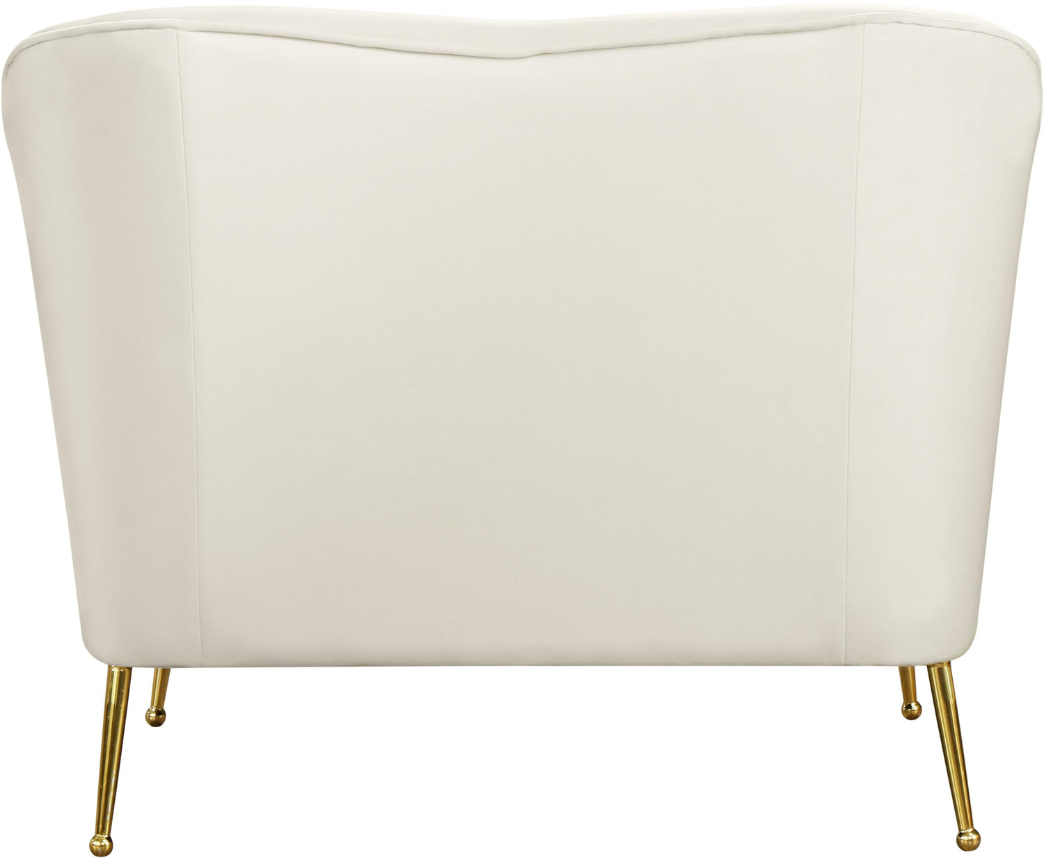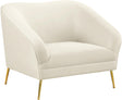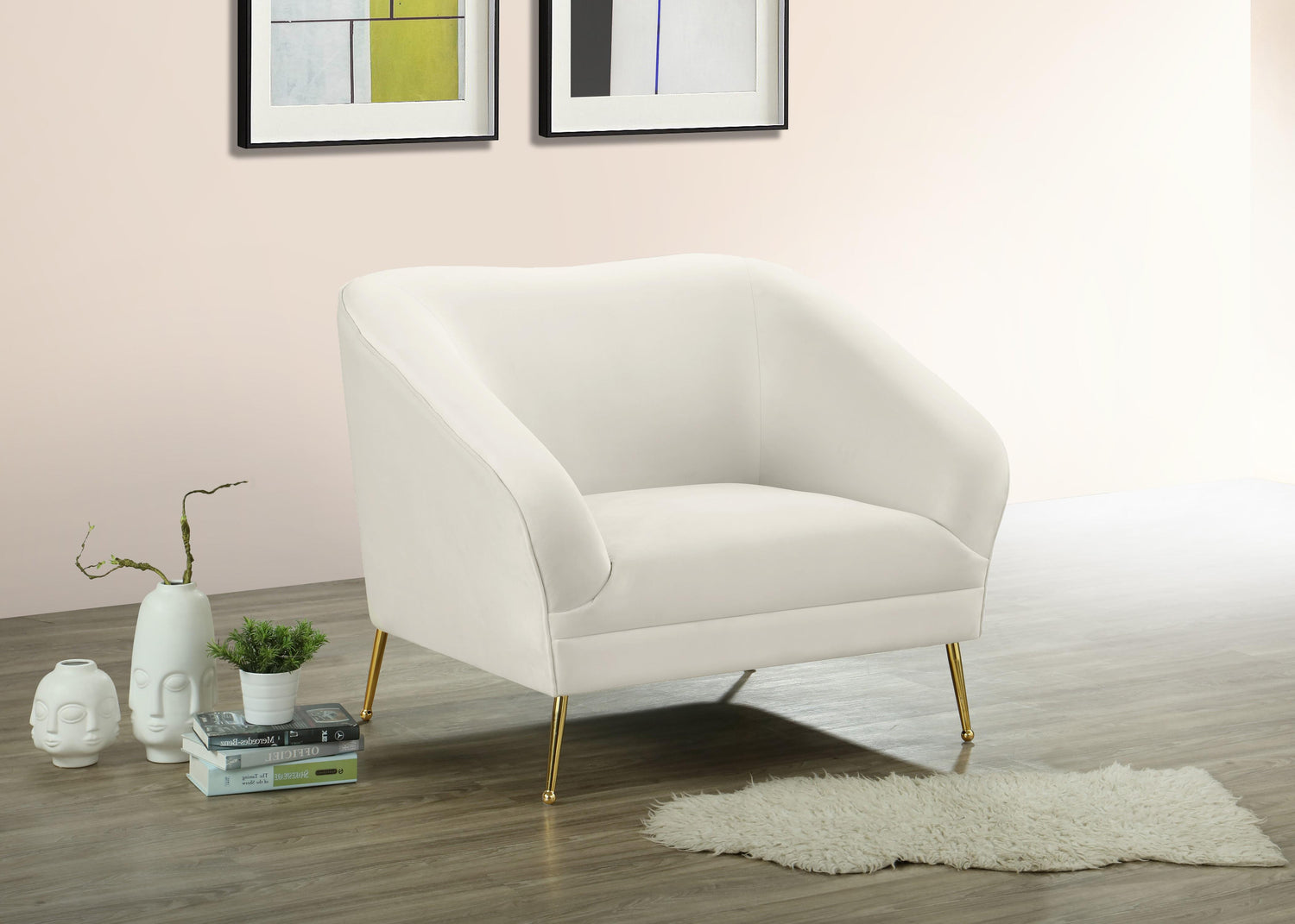 Create instant drama in your room with this Hermosa Velvet Chair by Meridian Furniture. The mid-century design makes the chair a true standout among other furnishings, with its sleek curved back and arms that create an aesthetically pleasing silhouette. The soft cream velvet upholstery feels sleek and sumptuous to the skin and gives your room an upscale look. Gold legs finish off the design, each of them with a ball design on the foot for added sophistication.