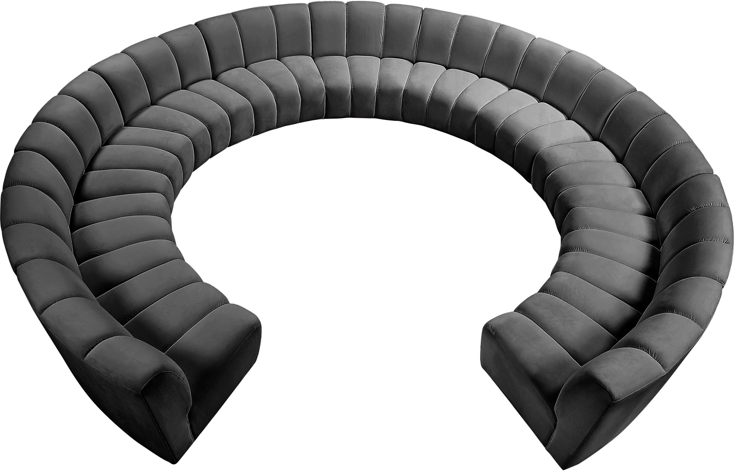 Create a seating group that works for every possible situation with this Infinity 11-piece sectional and other pieces in the Infinity collection. Upholstered in soft grey velvet material that feels great against the skin and offers long-wearing beauty, this piece fits with other Infinity items for an infinite number of combinations that get your seating requirements just right but that look just as nice when used on their own.