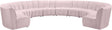 Create a seating group that works for every possible situation with this Infinity 10-piece sectional and other pieces in the Infinity collection. Upholstered in soft pink velvet material that feels great against the skin and offers long-wearing beauty, this piece fits with other Infinity items for an infinite number of combinations that get your seating requirements just right but that look just as nice when used on their own.