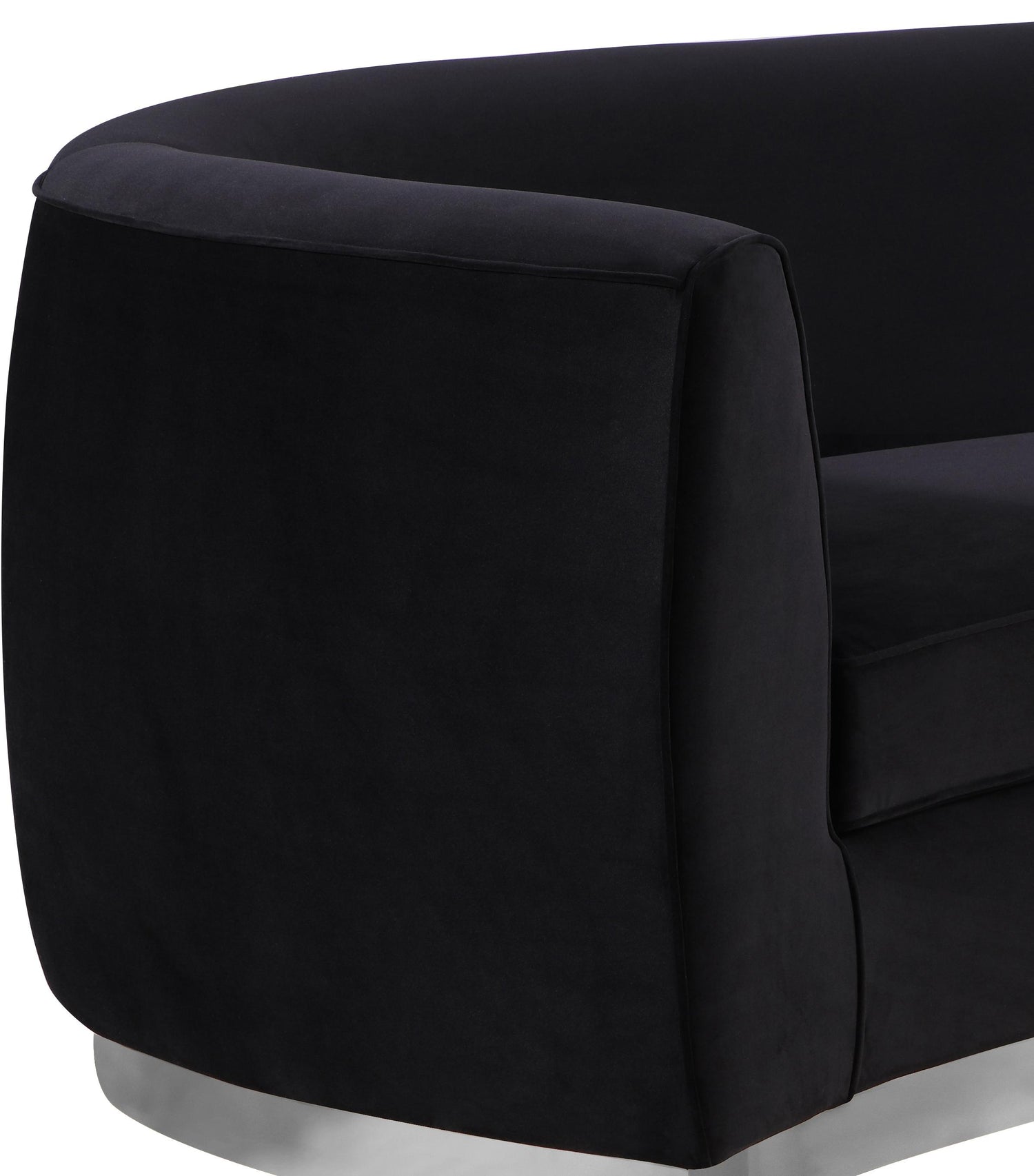The perfect mix of black velvet and gold stainless steel comes to life in your space with this Julian Black Velvet Chair. This bold black velvet chair comes upholstered in rich, sumptuous-to-the-touch velvet to make a fashionable statement in your space. The curved back design lends it a modish touch, and the gold stainless steel trim around its base adds to its glitzy appeal. Stage this chair alone or with other pieces in the Julian collection.
