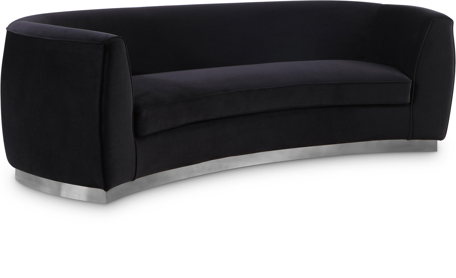 The perfect mix of black velvet and gold stainless steel comes to life in your space with this Julian Black Velvet Sofa. This bold black velvet sofa comes upholstered in rich, sumptuous-to-the-touch velvet to make a fashionable statement in your space. The curved back design lends it a modish touch, and the gold stainless steel trim around its base adds to its glitzy appeal. Stage this sofa alone or with other pieces in the Julian collection.