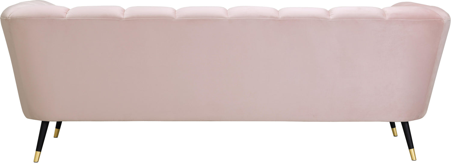 Sink your body into the inviting comfort of this Beaumont velvet sofa. Upholstered in a soft shade of pink with black metal legs tipped in gold, this chair oozes modern charm and up-to-the-minute comfort. The heavily stuffed arms, seat and back are bound to beckon at day���s end for you to sit and relax. Deep channel tufting on the back and arms adds to its uber welcoming look. Pair it with the matching pieces in the same collection for cohesive beauty.