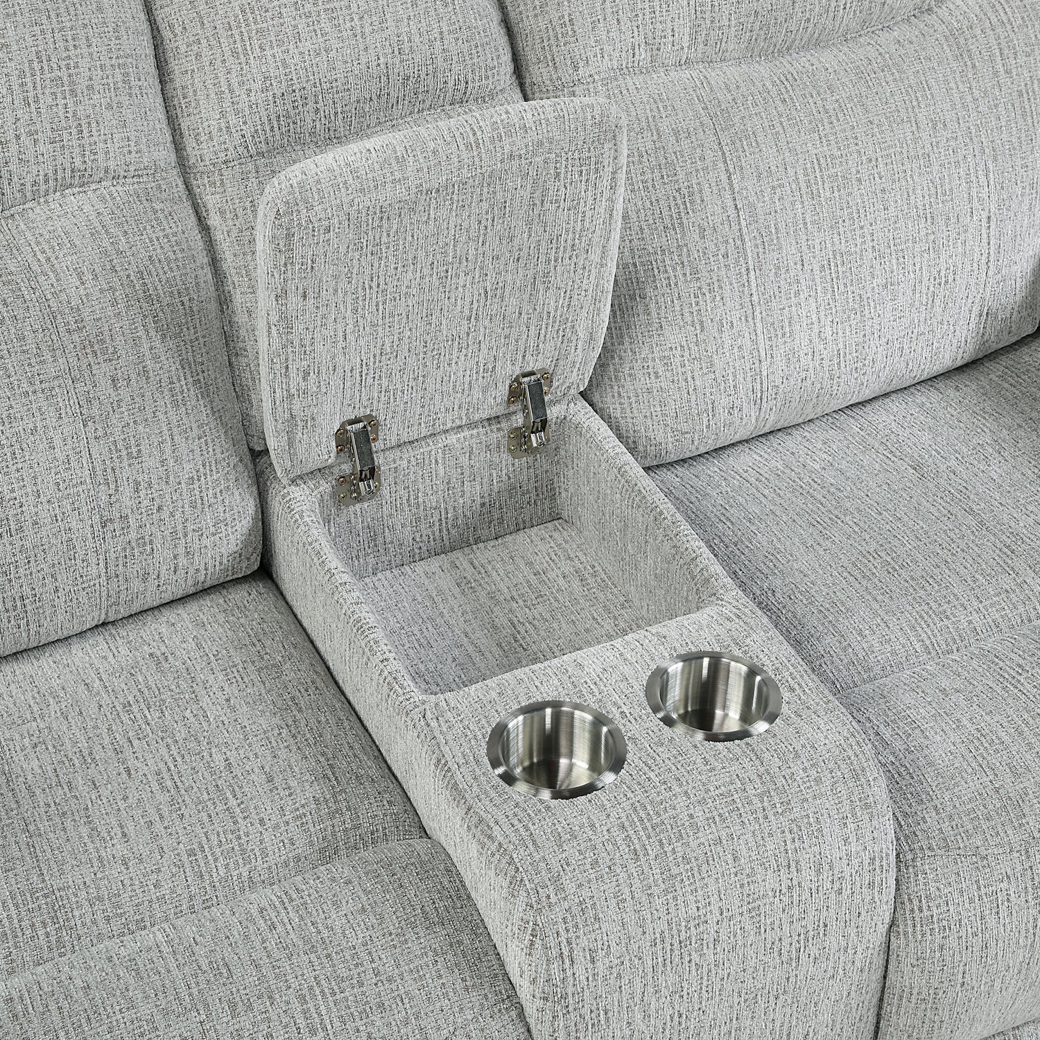 Enhance your living space with the perfect blend of comfort and functionality with the Chablis Reclining Console Loveseat in Mist Gray. Crafted with durable hardwood and plywood interior frames and supported by sturdy motion mechanisms, this loveseat offers a solid, long-lasting foundation for years of use. Upholstered in luxuriously soft, easy-care 100% polyester mist gray fabric, it provides a cozy and elegant seating experience. Designed for lasting comfort, the supportive seating combines resilient springs and plush foam cushions that maintain their shape over time. Effortlessly recline into generously cushioned seats, offering ultimate relaxation with minimal effort. For added convenience, the built-in center console features cupholders and a spacious storage compartment to keep essentials within reach. Integrated USB-A and USB-C charging ports ensure your devices stay powered, blending modern convenience with luxurious comfort. The Chablis Reclining Console Loveseat is the perfect choice for creating a stylish and inviting living area.