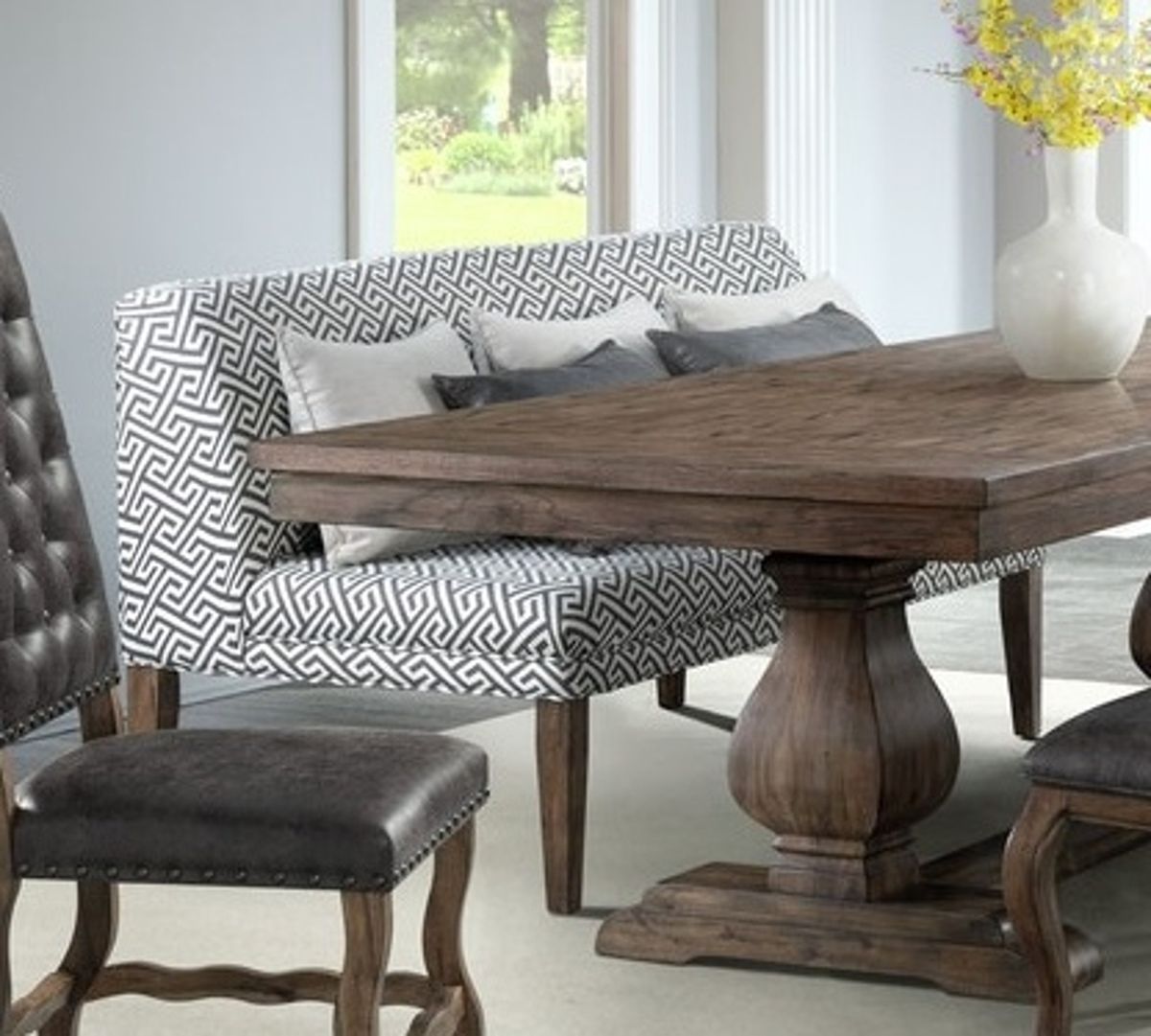 Elements Gramercy Sofa with 7 Pillow in Brown DGC530SF. A traditional design gets a contemporary update with the Gramercy Dining collection. This table will bring sophistication and comfort to your dining space. The dining table features a distinctive weathered brown finish with slight distressing, two 12 inch extensions, and a trestle base design for a casual country flair. This collection allows your personal style to shine. Mix and match the dining chair to fit your style and design. The large sofa bench is the perfect addition to finish the look.