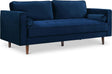 Stretch out and relax on this handsome Emily sofa. This Meridian Furniture sofa features wooden legs and a sturdy frame, so it's built for the long haul. Its vibrant navy velvet upholstery is a jewel tone that's simply stunning and that adds a pop of color to your day. The sofa's back cushions are plump and filled with premium material to cradle you in comfort, and it comes with two roll-style pillows for helping you prop up and unwind.