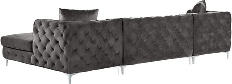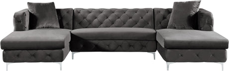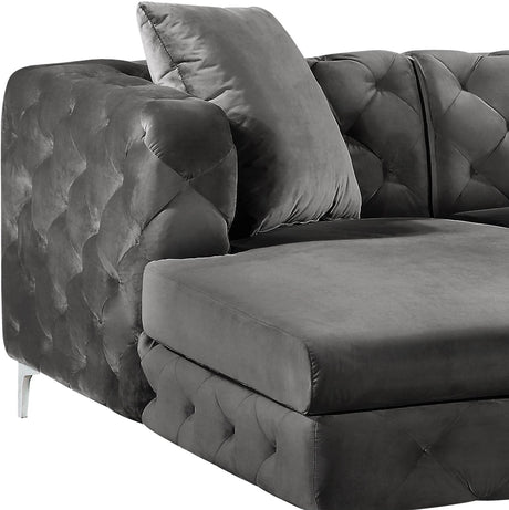 Bring fine living to the forefront with this Gail three-piece sectional. This cream-colored sectional features two chaise ends, giving you the room you need to snuggle up and get comfortable on movie night. The upholstery is made from velvet and simply luxurious to the touch. Deep tufting all over the backs and sides of this unit add to its glamorous vibe, while the chromed legs finish off the design on a modern note. This sectional comes with pillows for added comfort and style.