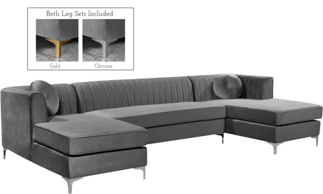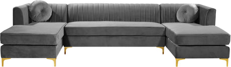 Sit back and get comfy on this navy velvet Graham three-piece sectional sofa. Plush navy velvet with a channel tufted back creates a contemporary display that is sure to be the focal point of your living room. This double chaise sectional features an inner width of 25 inches and outer width of 32 inches, with a width of 67 inches between both chaises, offering ample space for you and your loved ones to cuddle up and watch a movie after a long day. This sectional comes with complete sets of gold and chrome legs, so you can customize it to suit your existing decor.