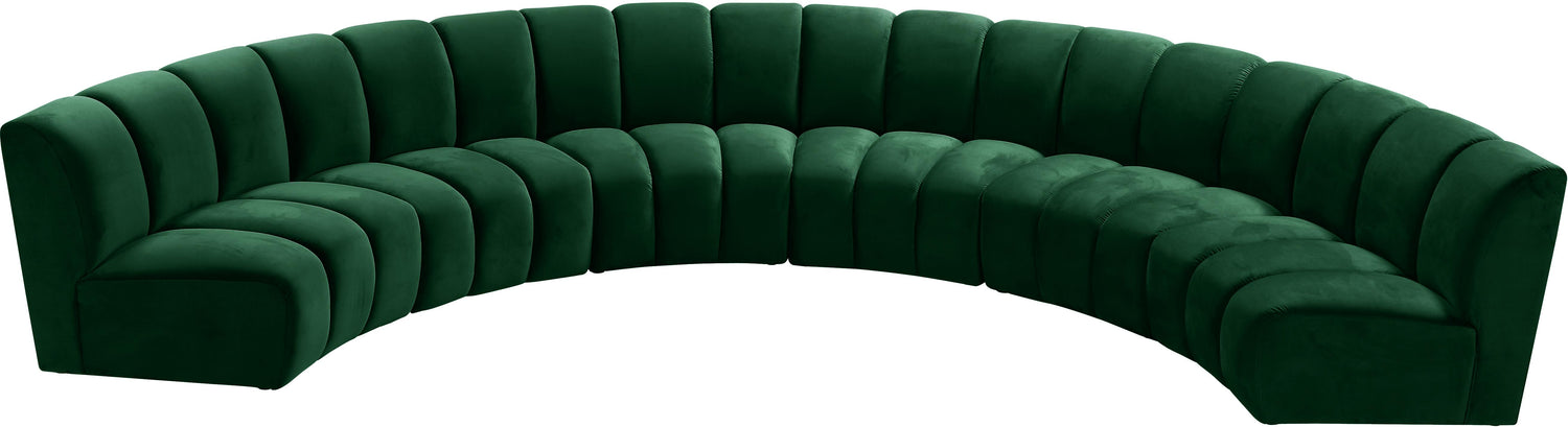 Create a seating group that works for every possible situation with this Infinity modular 6-piece sectional and other pieces in the Infinity collection. Upholstered in soft green velvet material that feels great against the skin and offers long-wearing beauty, this piece fits with other Infinity items for an infinite number of combinations that get your seating requirements just right but that look just as nice when used on their own.