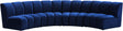 Create a seating group that works for every possible situation with this Infinity modular 4-piece sectional and other pieces in the Infinity collection. Upholstered in soft navy velvet material that feels great against the skin and offers long-wearing beauty, this piece fits with other Infinity items for an infinite number of combinations that get your seating requirements just right but that look just as nice when used on their own.