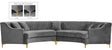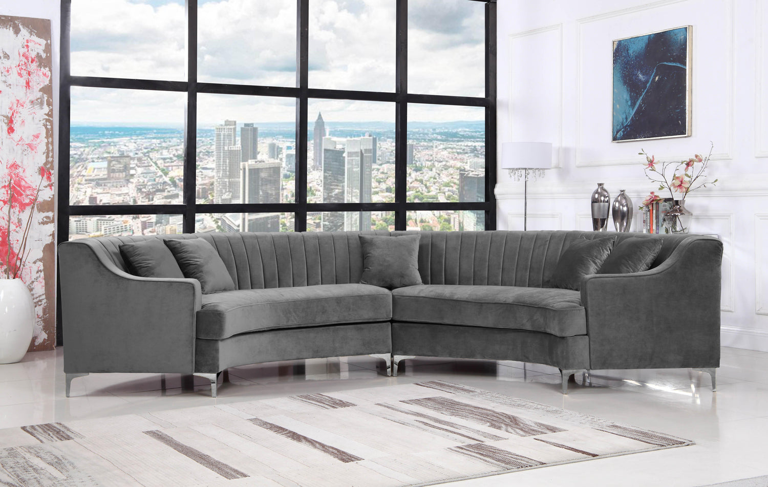 Give your living room a modern upgrade with this contemporary grey velvet Jackson two-piece sectional sofa. Its channel tufting design adds texture to its plush grey velvet upholstery, creating a resting piece that is pleasing to the senses. Its lengthy, curved design provides ample space for you to stretch out, or cuddle up with your family. Complete sets of gold and chrome legs are included so you can customize this sectional to suit your existing decor.