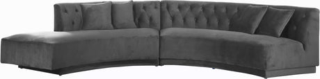 Kick back and prepare to get comfy with this plush olive velvet Kenzi two-piece sectional. This curved sectional provides ample space for you to spread out and take a luxurious nap, or cuddle up with your whole clan and watch a movie in the evening. Deep button tufting adds texture to its plush olive velvet upholstery, and its contemporary design makes this a sectional sofa the perfect focal point for any modern living room.