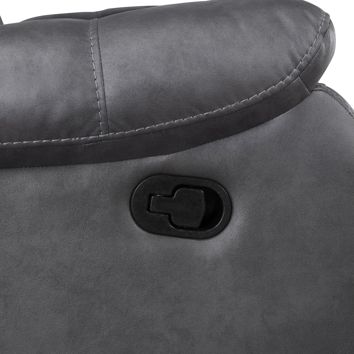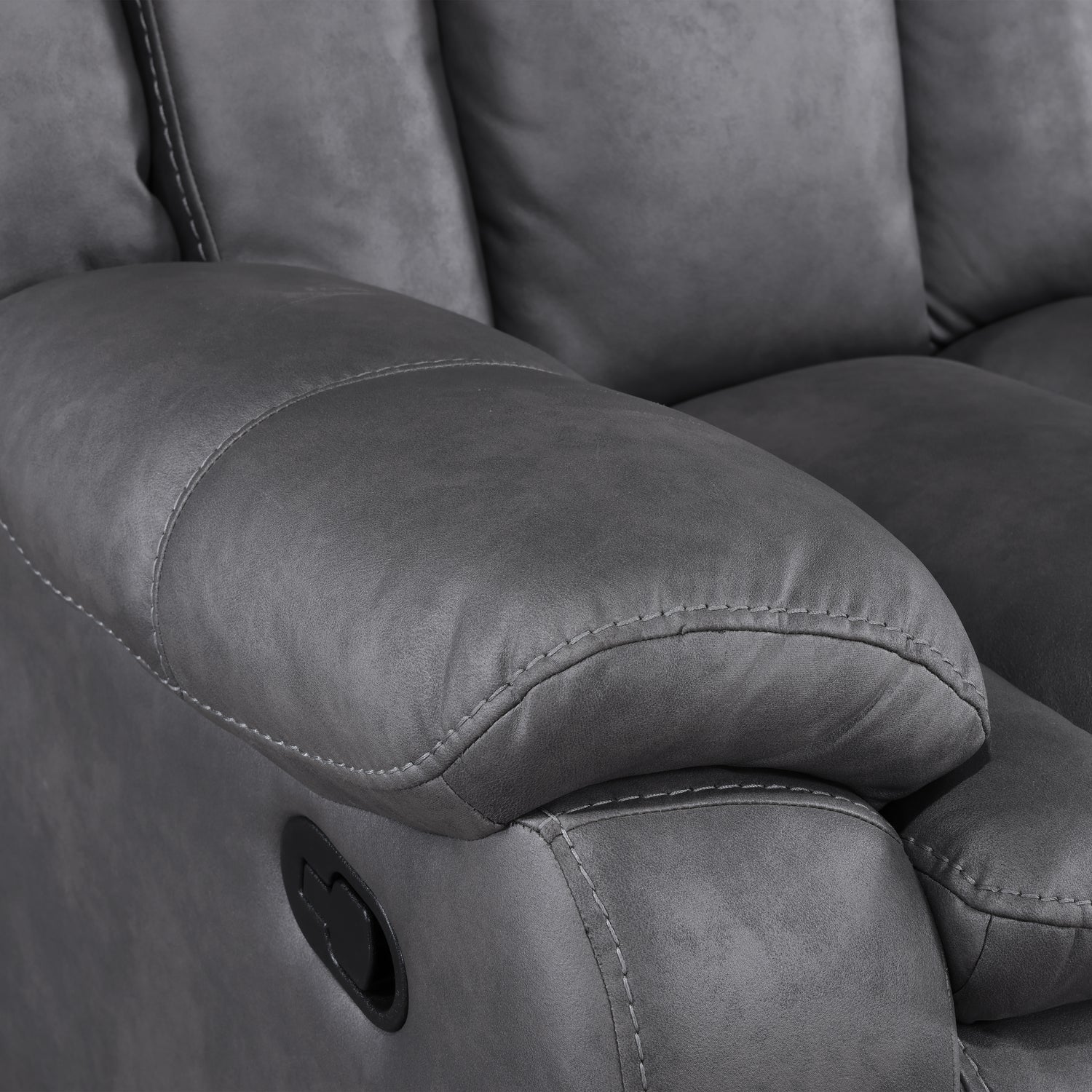 The Morello Dual Recliner Console Loveseat in gray offers a perfect combination of comfort and style for your living space. Upholstered in sumptuously soft 100% polyester fabric in a gray color, it mimics the luxurious look of leather without the higher price tag. The Morello Set features double-stitch detailing, ensuring durability and a sophisticated touch. Plush, overstuffed arm, seat, and back cushions are contoured to provide enhanced comfort, making every seat inviting. With fully upholstered chaise recliner footrests, you can effortlessly find the ultimate relaxation. Built with hardwood and manufactured wood frames, coil spring cushions wrapped in resilient foam and polyester, and no-sag seat suspension, this loveseat promises years of enjoyment. The casual, transitional style, with its leather-look upholstery and overstuffed cushioning, creates a comfortable, lived-in ambiance, making the Morello Dual Recliner Console Loveseat a practical and stylish choice for any home.